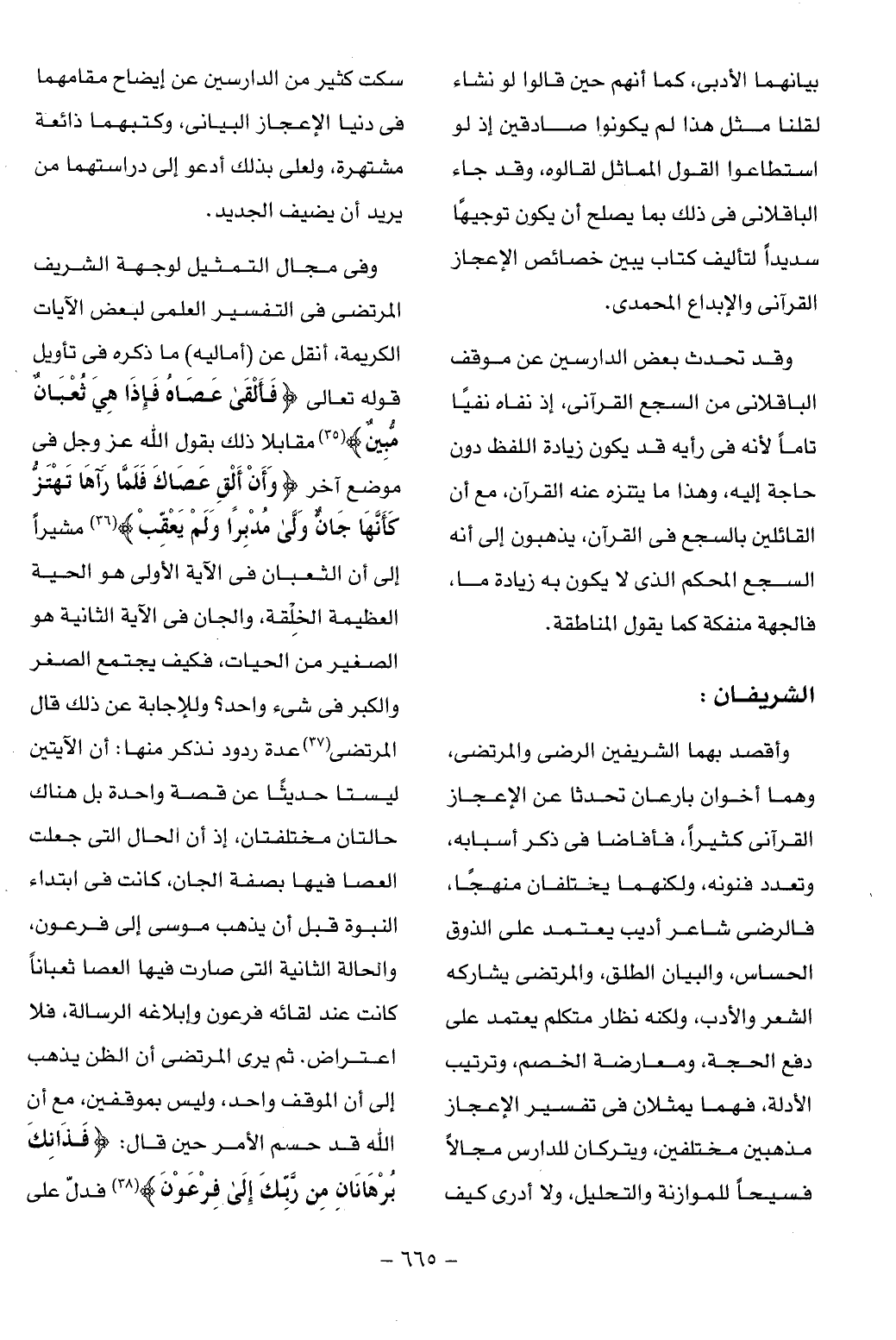 وفى مجال التمثيل لوجهة الشريف المرتضى فى التفسير العلمى لبعض الآيات الكريمة، أنقل عن (أماليه) ما ذكره فى تأويل قوله تعالى فَأَلْقى عَصاهُ فَإِذا هِيَ ثُعْبانٌ مُبِينٌ (¬35) مقابلا ذلك بقول الله عز وجل فى موضع آخر وَأَنْ أَلْقِ عَصاكَ فَلَمَّا رَآها تَهْتَزُّ كَأَنَّها جَانٌّ وَلَّى مُدْبِراً وَلَمْ يُعَقِّبْ (¬36) مشيرا إلى أن الثعبان فى الآية الأولى هو الحية العظيمة الخلقة، والجان فى الآية الثانية هو الصغير من الحيات، فكيف يجتمع الصغر والكبر فى شىء واحد؟ وللإجابة عن ذلك قال المرتضى (¬37) عدة ردود نذكر منها: أن الآيتين ليستا حديثا عن قصة واحدة بل هناك حالتان مختلفتان، إذ أن الحال التى جعلت العصا فيها بصفة الجان، كانت فى ابتداء النبوة قبل أن يذهب موسى إلى فرعون، والحالة الثانية التى صارت فيها العصا ثعبانا كانت عند لقائه فرعون وإبلاغه الرسالة، فلا اعتراض. ثم يرى المرتضى أن الظن يذهب إلى أن الموقف واحد، وليس بموقفين، مع أن الله قد حسم الأمر حين قال: فَذانِكَ بُرْهانانِ مِنْ رَبِّكَ إِلى فِرْعَوْنَ (¬38) فدلّ على