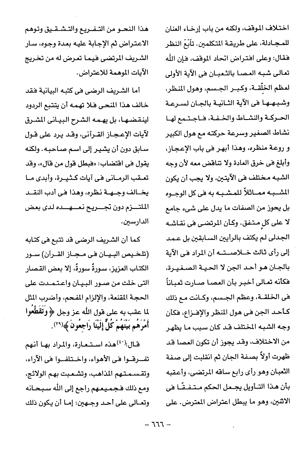 كما أن الشريف الرضى قد تتبع فى كتابه (تلخيص البيان فى مجاز القرآن) سور الكتاب العزيز، سورة سورة، إلا بعض القصار التى خلت من صور البيان واعتمدت على الحجة المقنعة، والإلزام المفحم، وأضرب المثل لما عقب به على قول الله عز وجل: وَتَقَطَّعُوا أَمْرَهُمْ بَيْنَهُمْ كُلٌّ إِلَيْنا راجِعُونَ (¬39).