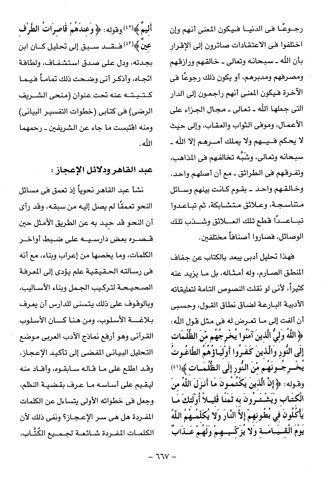 اللَّهُ وَلِيُّ الَّذِينَ آمَنُوا يُخْرِجُهُمْ مِنَ الظُّلُماتِ إِلَى النُّورِ وَالَّذِينَ كَفَرُوا أَوْلِياؤُهُمُ الطَّاغُوتُ يُخْرِجُونَهُمْ مِنَ النُّورِ إِلَى الظُّلُماتِ (¬41) وقوله: إِنَّ الَّذِينَ يَكْتُمُونَ ما أَنْزَلَ اللَّهُ مِنَ الْكِتابِ وَيَشْتَرُونَ بِهِ ثَمَناً قَلِيلًا أُولئِكَ ما يَأْكُلُونَ فِي بُطُونِهِمْ إِلَّا النَّارَ وَلا يُكَلِّمُهُمُ اللَّهُ يَوْمَ الْقِيامَةِ وَلا يُزَكِّيهِمْ وَلَهُمْ عَذابٌ أَلِيمٌ (¬42) وقوله: وَعِنْدَهُمْ قاصِراتُ الطَّرْفِ عِينٌ (¬43) فقد سبق إلى تحليل كان ابن بجدته، ودل على صدق استشفاف، ولطافة اتجاه، وأذكر أنى وضحت ذلك تماما فيما كتبته عنه تحت عنوان (منحى الشريف الرضى) فى كتابى (خطوات التفسير البيانى) ومنه اقتبست ما جاء عن الشريفين- رحمهما الله.