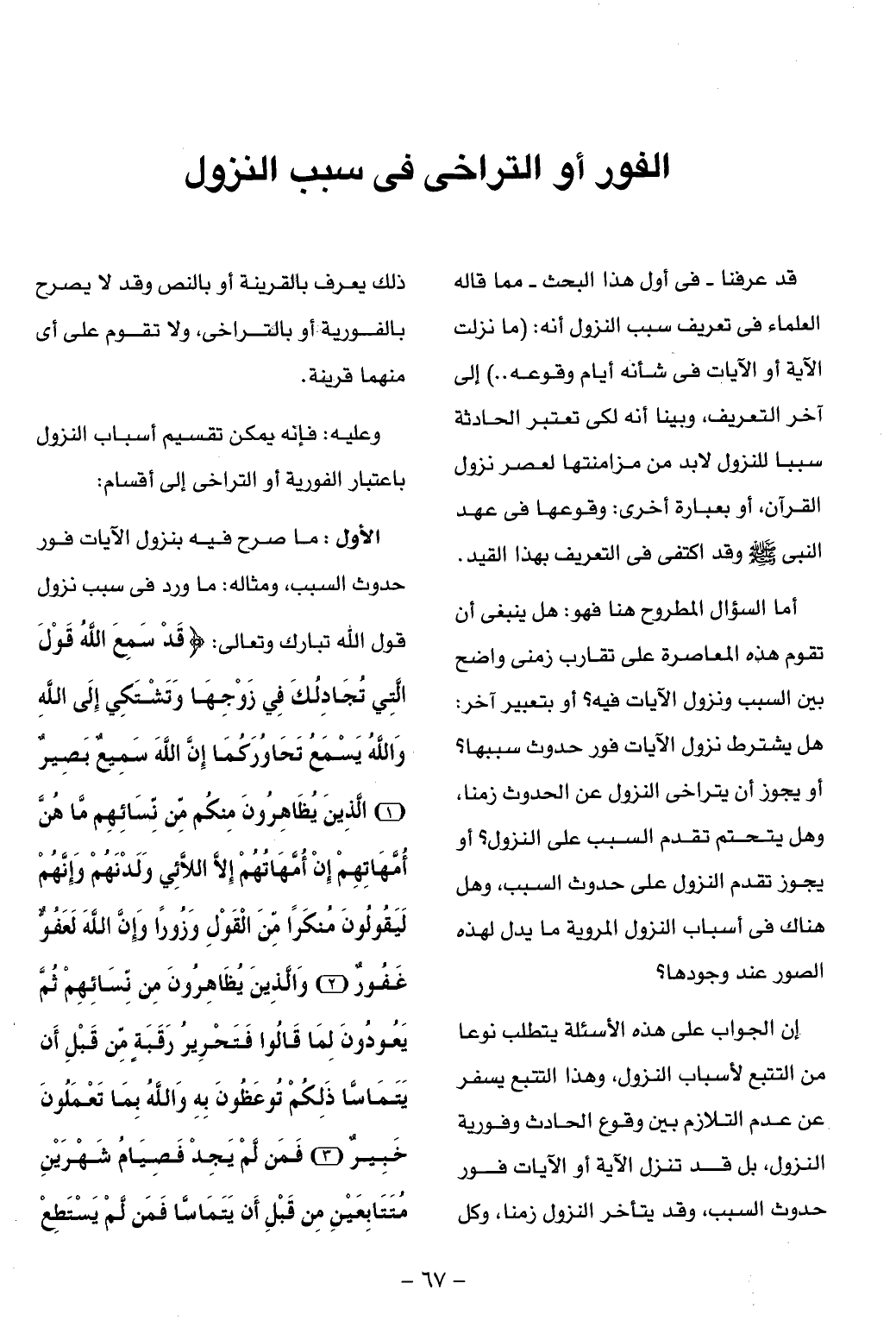 وعليه: فإنه يمكن تقسيم أسباب النزول باعتبار الفورية أو التراخى إلى أقسام:
