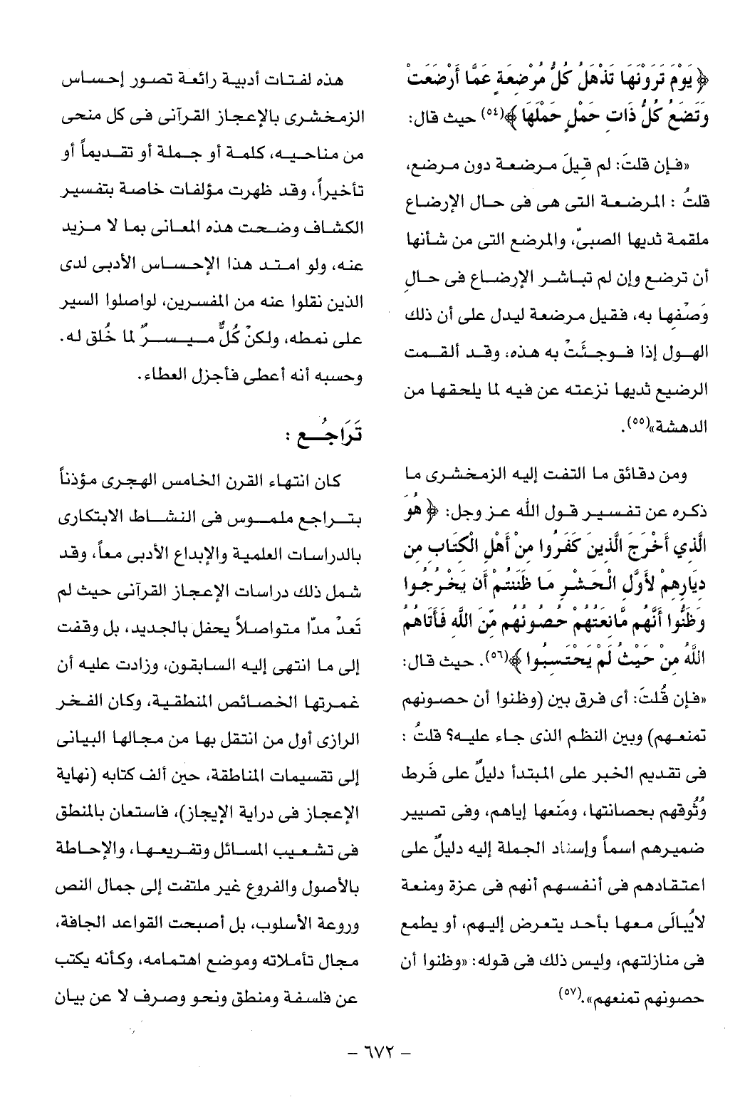 هذه لفتات أدبية رائعة تصور إحساس الزمخشرى بالإعجاز القرآنى فى كل منحى من مناحيه، كلمة أو جملة أو تقديما أو تأخيرا، وقد ظهرت مؤلفات خاصة بتفسير الكشاف وضحت هذه المعانى بما لا مزيد عنه، ولو امتد هذا الإحساس الأدبى لدى الذين نقلوا عنه من المفسرين، لواصلوا السير على نمطه، ولكن كلّ ميسر لما خلق له.