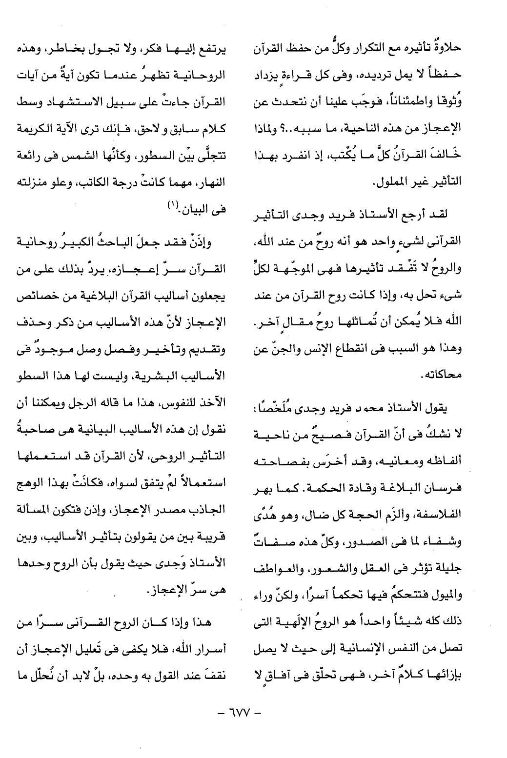 وإذن فقد جعل الباحث الكبير روحانية القرآن سرّ إعجازه، يردّ بذلك على من يجعلون أساليب القرآن البلاغية من خصائص الإعجاز لأنّ هذه الأساليب من ذكر وحذف وتقديم وتأخير وفصل وصل موجود فى الأساليب البشرية، وليست لها هذا السطو الآخذ للنفوس، هذا ما قاله الرجل ويمكننا أن نقول إن هذه الأساليب البيانية هى صاحبة التأثير الروحى، لأن القرآن قد استعملها استعمالا لم يتفق لسواه، فكانت بهذا الوهج الجاذب مصدر الإعجاز، وإذن فتكون المسألة قريبة بين من يقولون بتأثير الأساليب، وبين الأستاذ وجدى حيث يقول بأن الروح وحدها هى سرّ الإعجاز.