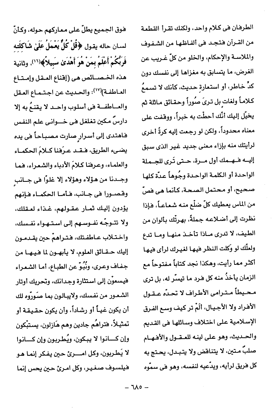 الطرفان فى كلام واحد، ولكنك تقرأ القطعة من القرآن فتجد فى ألفاظها من الشفوف والملاسة والإحكام، والخلو من كلّ غريب عن الغرض، ما يتسابق به مغزاها إلى نفسك دون كدّ خاطر، أو استعارة حديث، كأنك لا تسمع كلاما ولغات بل ترى صورا وحقائق ماثلة ثم يخيّل إليك أنّك أحطت به خبرا، ووقفت على معناه محدودا، ولكن لو رجعت إليه كرة أخرى لرأيتك منه بإزاء معنى جديد غير الذى سبق إليه فهمك أول مرة، حتى ترى للجملة الواحدة أو الكلمة الواحدة وجوها عدّة كلها صحيح، أو محتمل الصحة، كأنما هى فصّ من الماس يعطيك كلّ ضلع منه شعاعا، فإذا نظرت إلى أضلاعه جملة، بهرتك بألوان من الطيف، لا تدرى ماذا تأخذ منها وما تدع ولعلّك لو وكلت النظر فيها لغيرك لرأى فيها أكثر مما رأيت، وهكذا نجد كتابا مفتوحا مع الزمان يأخذ منه كل فرد ما تيسّر له، بل ترى محيطا مترامى الأطراف لا تحدّه عقول الأفراد ولا الأجيال، ألم تر كيف وسع الفرق الإسلامية على اختلاف وسائلها فى القديم والحديث، وهو على لينه للعقول والأفهام صلب متين، لا يتناقض ولا يتبدل، يحتج به كل فريق لرأيه، ويدّعيه لنفسه، وهو فى سمّوه فوق الجميع يطلّ على معاركهم حوله، وكأنّ لسان حاله يقول قُلْ كُلٌّ يَعْمَلُ عَلى شاكِلَتِهِ فَرَبُّكُمْ أَعْلَمُ بِمَنْ هُوَ أَهْدى سَبِيلًا (¬16)، وثانية هذه الخصائص هى (إقناع العقل وإمتاع العاطفة) (¬17): والحديث عن اجتماع العقل والعاطفة فى أسلوب واحد لا يقنع به إلا دارس مكين تغلغل فى خوانى علم النفس فاهتدى إلى أسرار صارت مصباحا فى يده يضيء الطريق، فقد عرفنا كلام الحكماء والعلماء، وعرفنا كلام الأدباء والشعراء، فما وجدنا من هؤلاء وهؤلاء إلا غلوّا فى جانب وقصورا فى جانب، فأما الحكماء فإنهم يؤدون إليك ثمار عقولهم، غذاء لعقلك، ولا تتوجّه نفوسهم إلى استهواء نفسك، واختلاف عاطفتك، فتراهم حين يقدمون إليك حقائق العلوم، لا يأبهون لما فيها من جفاف وعرى، ونبوّ عن الطباع، أما الشعراء فيسعون إلى استثارة وجدانك، وتحريك أوتار الشعور من نفسك، ولا يبالون بما صوّروه لك أن يكون غيا أو رشادا، وأن يكون حقيقة أو تمثيلا، فتراهم جادين وهم هازلون، يستبكون وإن كانوا لا يبكون، ويطربون وإن كانوا لا يطربون، وكل امرئ حين يفكر إنما هو فيلسوف صغير، وكل امرئ حين يحس إنما