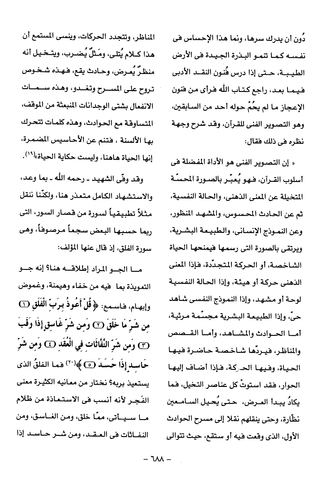 وقد وفّى الشهيد- رحمه الله- بما وعد، والاستشهاد الكامل متعذر هنا، ولكنّنا ننقل مثلا تطبيقيا لسورة من قصار السور، التى ربما حسبها البعض سجعا مرصوفا، وهى سورة الفلق، إذ قال عنها المؤلف: