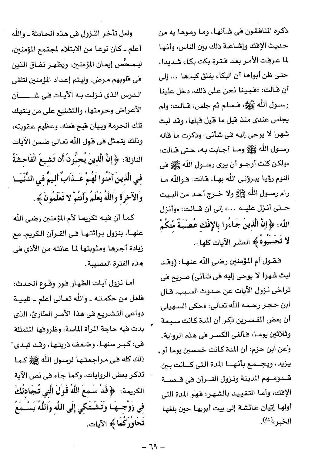 ذكره المنافقون فى شأنها، وما رموها به من حديث الإفك وإشاعة ذلك بين الناس، وأنها لما عرفت الأمر بعد فترة بكت بكاء شديدا، حتى ظن أبواها أن البكاء يفلق كبدها ... إلى أن قالت: «فبينا نحن على ذلك، دخل علينا رسول الله صلّى الله عليه وسلم، فسلم ثم جلس، قالت: ولم يجلس عندى منذ قيل ما قيل قبلها، وقد لبث شهرا لا يوحى إليه فى شأنى» وذكرت ما قاله رسول الله صلّى الله عليه وسلم وما أجابت به، حتى قالت: