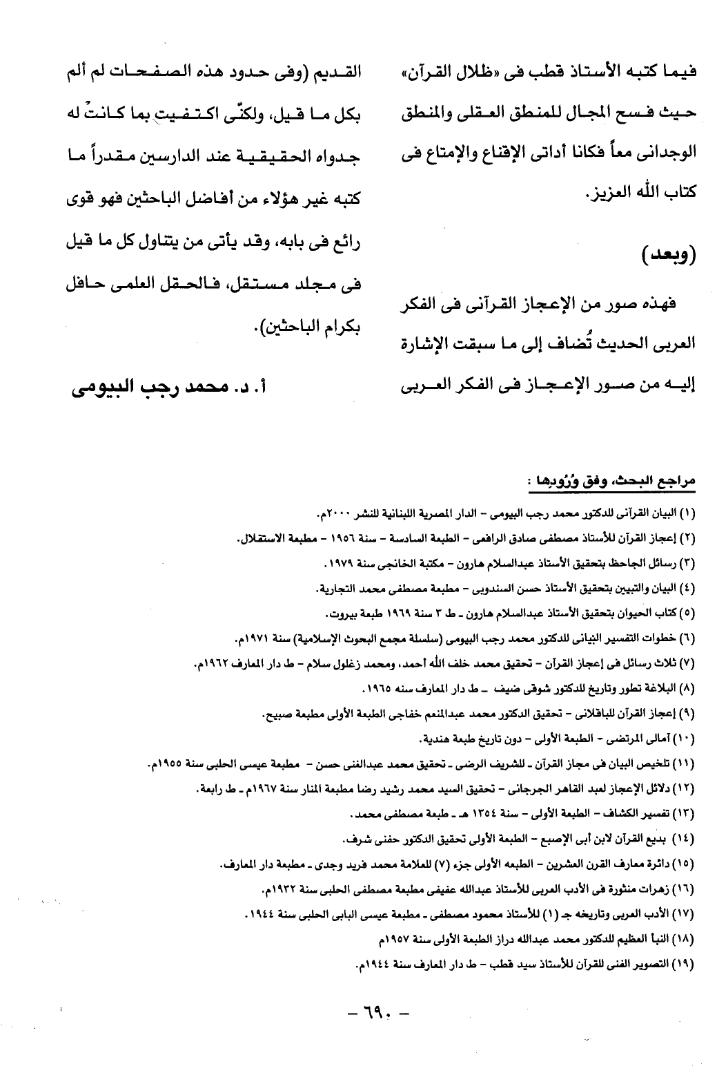 مراجع البحث، وفق ورودها: (1) البيان القرآنى للدكتور محمد رجب البيومى- الدار المصرية اللبنانية للنشر 2000 م.