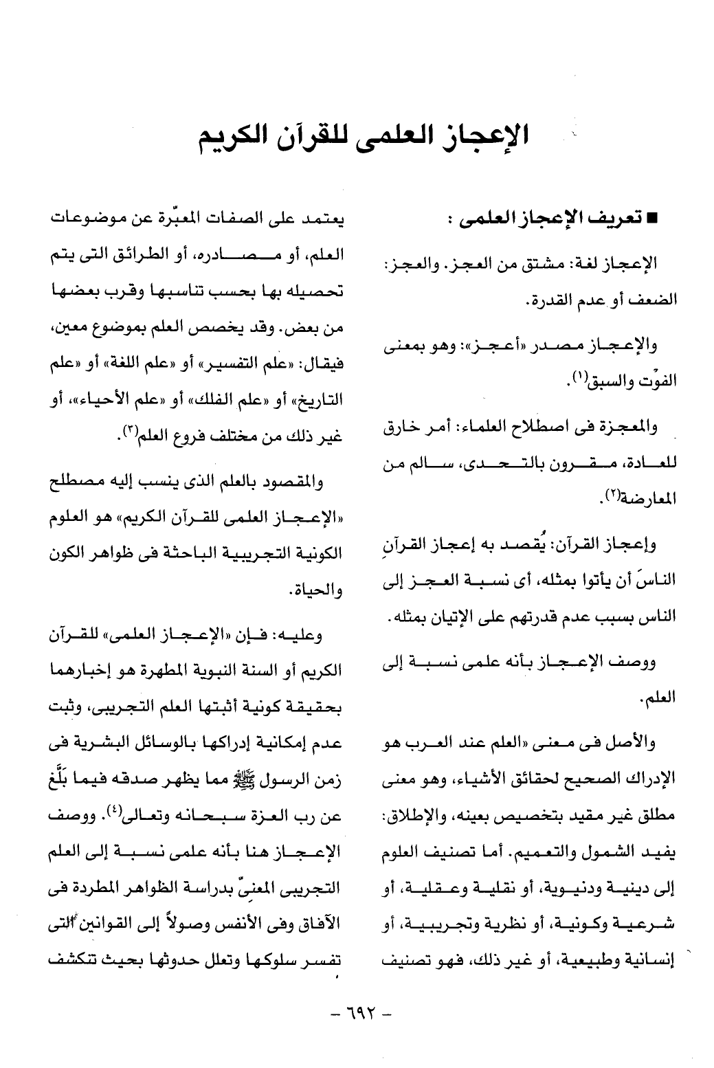 وعليه: فإن «الإعجاز العلمى» للقرآن الكريم أو السنة النبوية المطهرة هو إخبارهما بحقيقة كونية أثبتها العلم التجريبى، وثبت عدم إمكانية إدراكها بالوسائل البشرية فى زمن الرسول صلّى الله عليه وسلّم مما يظهر صدقه فيما بلّغ عن رب العزة سبحانه وتعالى (¬4). ووصف الإعجاز هنا بأنه علمى نسبة إلى العلم التجريبى المعنىّ بدراسة الظواهر المطردة فى الآفاق وفى الأنفس وصولا إلى القوانين التى تفسر سلوكها وتعلل حدوثها بحيث تنكشف