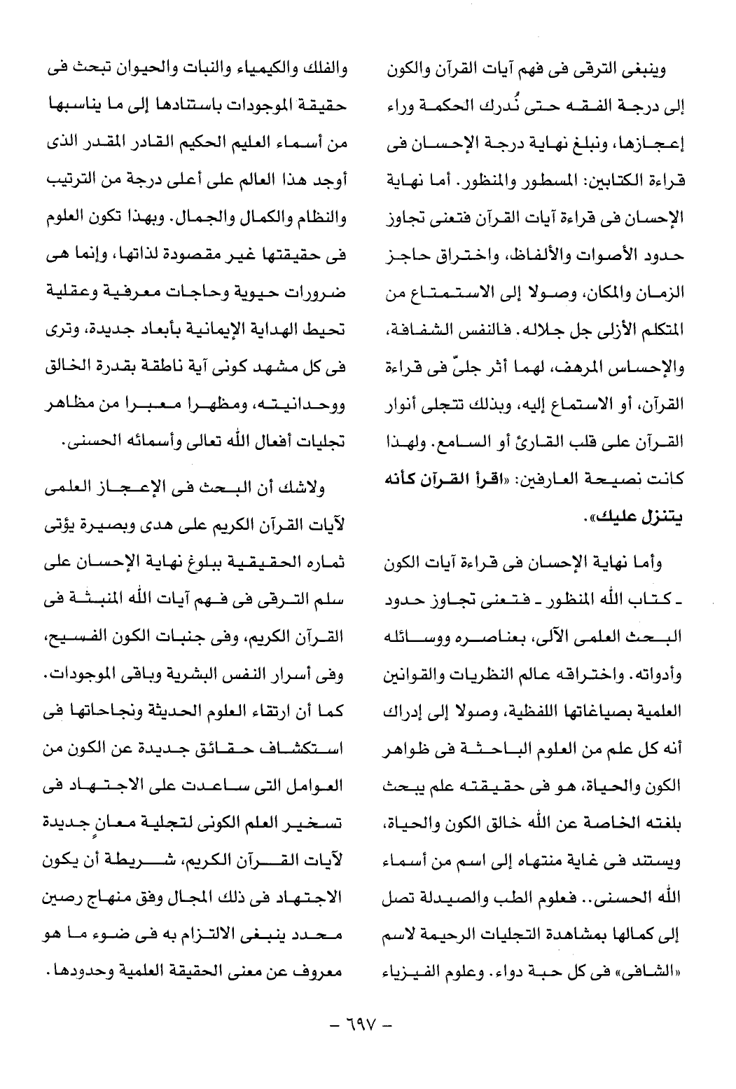 وأما نهاية الإحسان فى قراءة آيات الكون- كتاب الله المنظور- فتعنى تجاوز حدود البحث العلمى الآلى، بعناصره ووسائله وأدواته. واختراقه عالم النظريات والقوانين العلمية بصياغاتها اللفظية، وصولا إلى إدراك أنه كل علم من العلوم الباحثة فى ظواهر الكون والحياة، هو فى حقيقته علم يبحث بلغته الخاصة عن الله خالق الكون والحياة، ويستند فى غاية منتهاه إلى اسم من أسماء الله الحسنى .. فعلوم الطب والصيدلة تصل إلى كمالها بمشاهدة التجليات الرحيمة لاسم «الشافى» فى كل حبة دواء. وعلوم الفيزياء والفلك والكيمياء والنبات والحيوان تبحث فى حقيقة الموجودات باستنادها إلى ما يناسبها من أسماء العليم الحكيم القادر المقدر الذى أوجد هذا العالم على أعلى درجة من الترتيب والنظام والكمال والجمال. وبهذا تكون العلوم فى حقيقتها غير مقصودة لذاتها، وإنما هى ضرورات حيوية وحاجات معرفية وعقلية تحيط الهداية الإيمانية بأبعاد جديدة، وترى فى كل مشهد كونى آية ناطقة بقدرة الخالق ووحدانيته، ومظهرا معبرا من مظاهر تجليات أفعال الله تعالى وأسمائه الحسنى.
