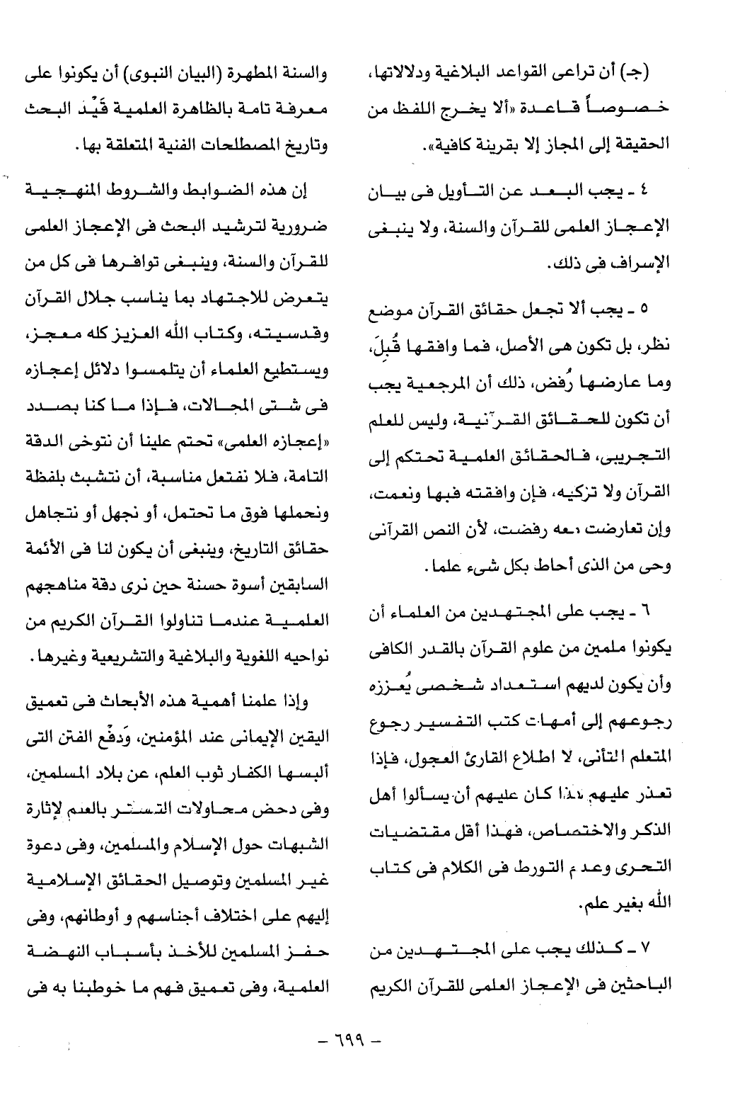 إن هذه الضوابط والشروط المنهجية ضرورية لترشيد البحث فى الإعجاز العلمى للقرآن والسنة، وينبغى توافرها فى كل من يتعرض للاجتهاد بما يناسب جلال القرآن وقدسيته، وكتاب الله العزيز كله معجز، ويستطيع العلماء أن يتلمسوا دلائل إعجازه فى شتى المجالات، فإذا ما كنا بصدد «إعجازه العلمى» تحتم علينا أن نتوخى الدقة التامة، فلا نفتعل مناسبة، أن نتشبث بلفظة ونحملها فوق ما تحتمل، أو نجهل أو نتجاهل حقائق التاريخ، وينبغى أن يكون لنا فى الأئمة السابقين أسوة حسنة حين نرى دقة مناهجهم العلمية عند ما تناولوا القرآن الكريم من نواحيه اللغوية والبلاغية والتشريعية وغيرها.