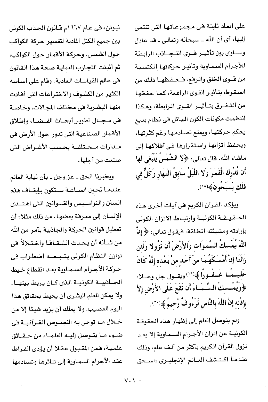 ولم يتوصل العلم إلى إظهار هذه الحقيقة الكونية عن اتزان الأجرام السماوية إلا بعد نزول القرآن الكريم بأكثر من ألف عام، وذلك عند ما اكتشف العالم الإنجليزى «إسحاق نيوتن» فى عام 1667 م قانون الجذب الكونى بين جميع الكتل المادية لتفسير حركة الكواكب حول الشمس، وحركة الأقمار حول الكواكب، ثم أثبتت التجارب العملية صحة هذا القانون فى عالم القياسات العادية. وقام على أساسه الكثير من الكشوف والاختراعات التى أفادت منها البشرية فى مختلف المجالات، وخاصة فى مجال تطوير أبحاث الفضاء وإطلاق الأقمار الصناعية التى تدور حول الأرض فى مدارات مختلفة بحسب الأغراض التى صنعت من أجلها.