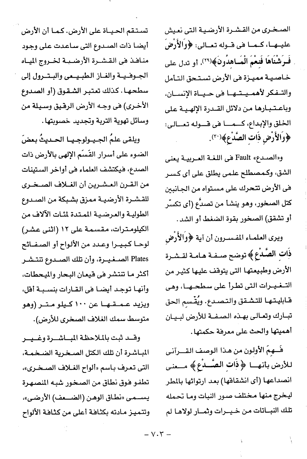 ويرى العلماء المفسرون أن آية وَالْأَرْضِ ذاتِ الصَّدْعِ توضح صفة هامة لقشرة الأرض وطبيعتها التى يتوقف عليها كثير من التغيرات التى تطرأ على سطحها، وهى قابليتها للتشقق والتصدع. ويقسم الحق تبارك وتعالى بهذه الصفة للأرض لبيان أهميتها والحث على معرفة حكمتها.