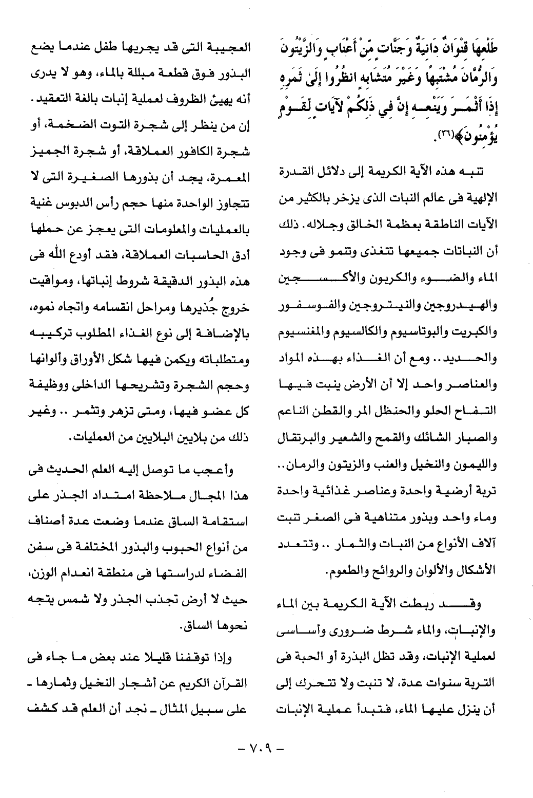 وقد ربطت الآية الكريمة بين الماء والإنبات، والماء شرط ضرورى وأساسى لعملية الإنبات، وقد تظل البذرة أو الحبة فى التربة سنوات عدة، لا تنبت ولا تتحرك إلى أن ينزل عليها الماء، فتبدأ عملية الإنبات العجيبة التى قد يجريها طفل عند ما يضع البذور فوق قطعة مبللة بالماء، وهو لا يدرى أنه يهيئ الظروف لعملية إنبات بالغة التعقيد.