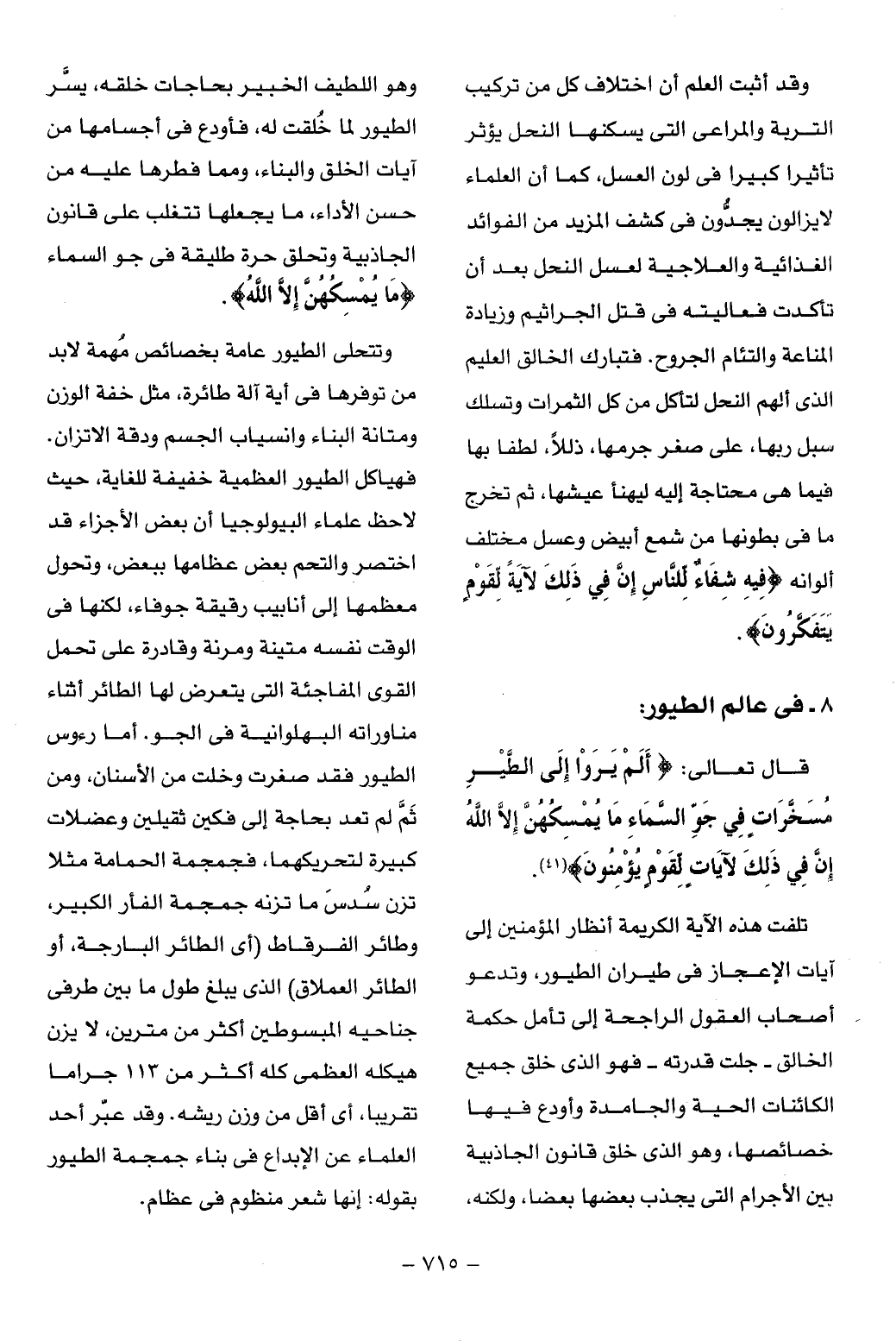 الكائنات الحية والجامدة وأودع فيها خصائصها، وهو الذى خلق قانون الجاذبية بين الأجرام التى يجذب بعضها بعضا، ولكنه، وهو اللطيف الخبير بحاجات خلقه، يسّر الطيور لما خلقت له، فأودع فى أجسامها من آيات الخلق والبناء، ومما فطرها عليه من حسن الأداء، ما يجعلها تتغلب على قانون الجاذبية وتحلق حرة طليقة فى جو السماء ما يُمْسِكُهُنَّ إِلَّا اللَّهُ.