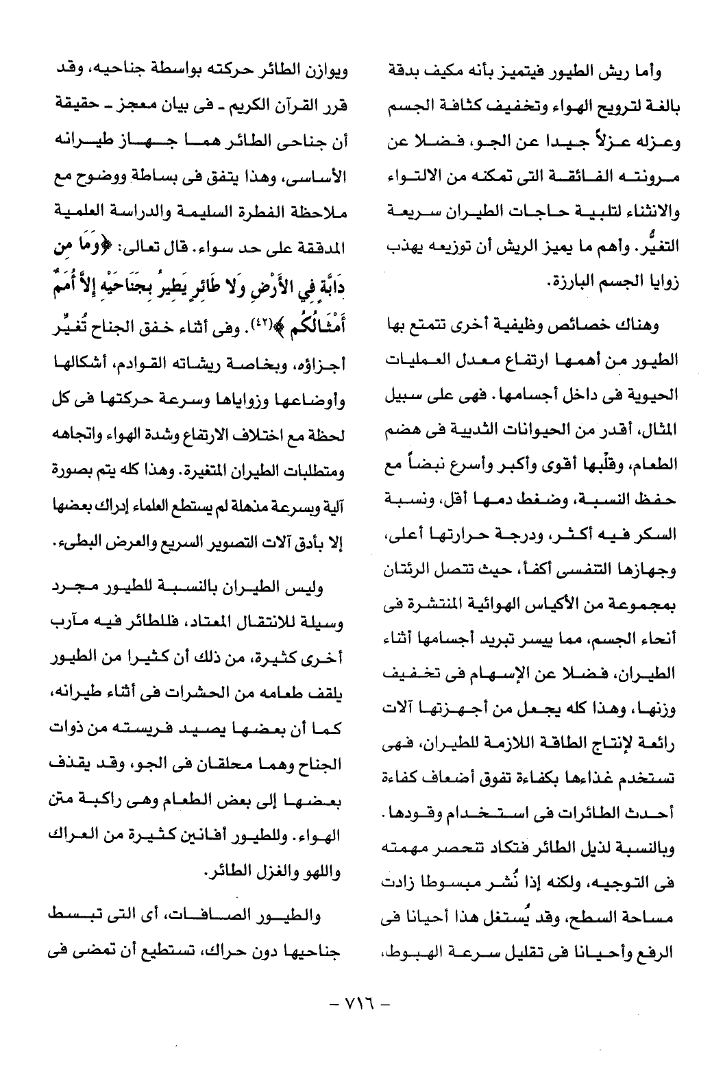 وبالنسبة لذيل الطائر فتكاد تنحصر مهمته فى التوجيه، ولكنه إذا نشر مبسوطا زادت مساحة السطح، وقد يستغل هذا أحيانا فى الرفع وأحيانا فى تقليل سرعة الهبوط، ويوازن الطائر حركته بواسطة جناحيه، وقد قرر القرآن الكريم- فى بيان معجز- حقيقة أن جناحى الطائر هما جهاز طيرانه الأساسى، وهذا يتفق فى بساطة ووضوح مع ملاحظة الفطرة السليمة والدراسة العلمية المدققة على حد سواء. قال تعالى: وَما مِنْ دَابَّةٍ فِي الْأَرْضِ وَلا طائِرٍ يَطِيرُ بِجَناحَيْهِ إِلَّا أُمَمٌ أَمْثالُكُمْ (¬42). وفى أثناء خفق الجناح تغيّر أجزاؤه، وبخاصة ريشاته القوادم، أشكالها وأوضاعها وزواياها وسرعة حركتها فى كل لحظة مع اختلاف الارتفاع وشدة الهواء واتجاهه ومتطلبات الطيران المتغيرة. وهذا كله يتم بصورة آلية وبسرعة مذهلة لم يستطع العلماء إدراك بعضها إلا بأدق آلات التصوير السريع والعرض البطىء.