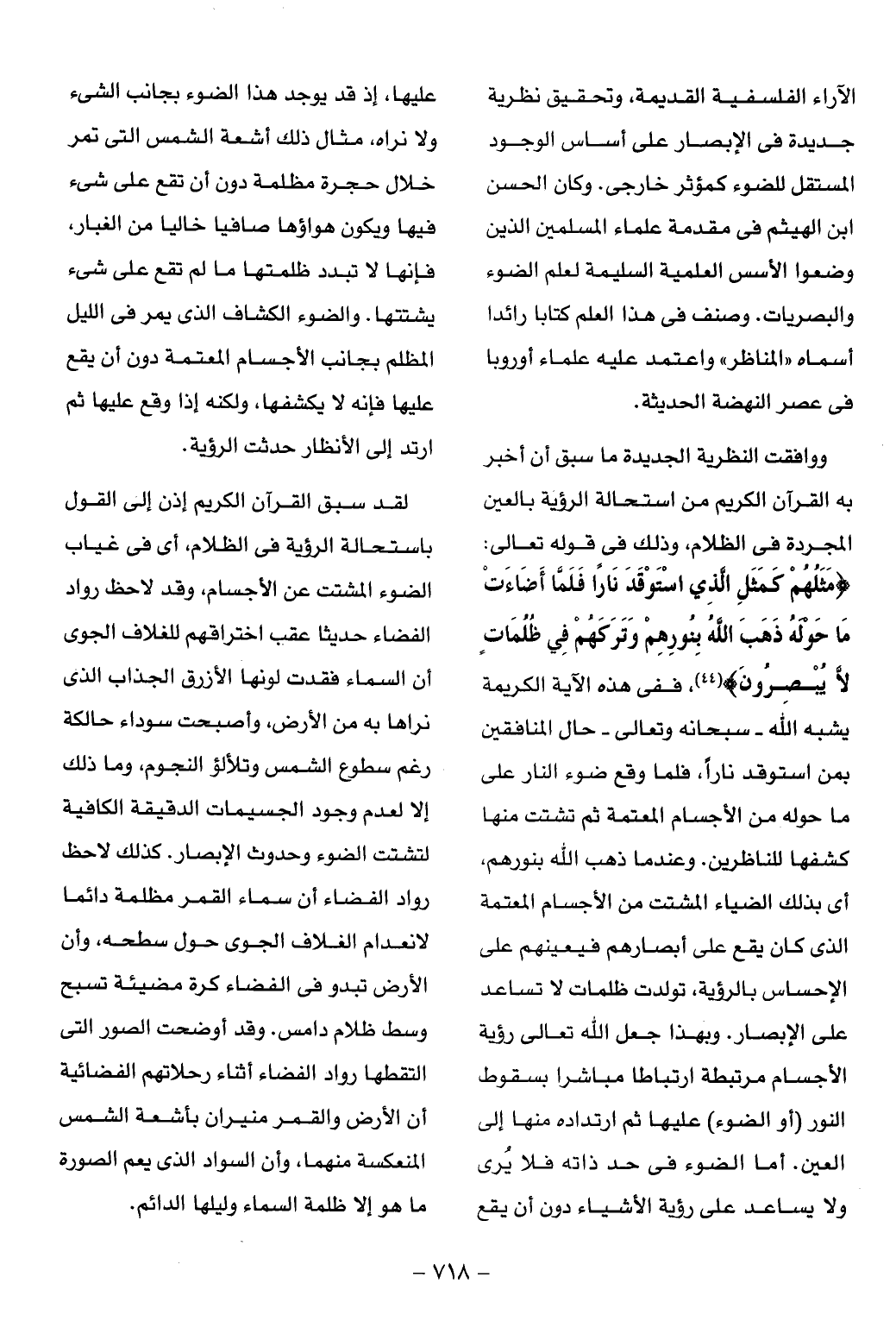 مَثَلُهُمْ كَمَثَلِ الَّذِي اسْتَوْقَدَ ناراً فَلَمَّا أَضاءَتْ ما حَوْلَهُ ذَهَبَ اللَّهُ بِنُورِهِمْ وَتَرَكَهُمْ فِي ظُلُماتٍ لا يُبْصِرُونَ (¬44)، ففي هذه الآية الكريمة يشبه الله- سبحانه وتعالى- حال المنافقين بمن استوقد نارا، فلما وقع ضوء النار على ما حوله من الأجسام المعتمة ثم تشتت منها كشفها للناظرين. وعند ما ذهب الله بنورهم، أى بذلك الضياء المشتت من الأجسام المعتمة الذى كان يقع على أبصارهم فيعينهم على الإحساس بالرؤية، تولدت ظلمات لا تساعد على الإبصار. وبهذا جعل الله تعالى رؤية الأجسام مرتبطة ارتباطا مباشرا بسقوط النور (أو الضوء) عليها ثم ارتداده منها إلى العين. أما الضوء فى حد ذاته فلا يرى ولا يساعد على رؤية الأشياء دون أن يقع عليها، إذ قد يوجد هذا الضوء بجانب الشيء ولا نراه، مثال ذلك أشعة الشمس التى تمر خلال حجرة مظلمة دون أن تقع على شىء فيها ويكون هواؤها صافيا خاليا من الغبار، فإنها لا تبدد ظلمتها ما لم تقع على شىء يشتتها. والضوء الكشاف الذى يمر فى الليل المظلم بجانب الأجسام المعتمة دون أن يقع عليها فإنه لا يكشفها، ولكنه إذا وقع عليها ثم ارتد إلى الأنظار حدثت الرؤية.