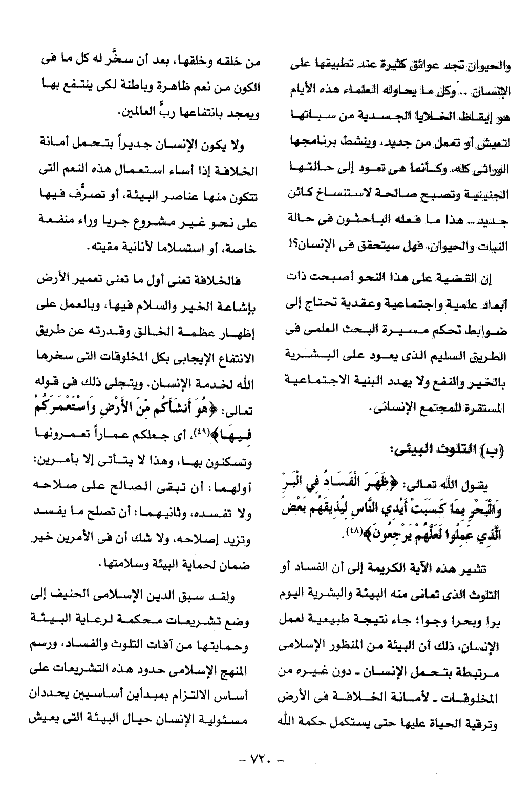 تشير هذه الآية الكريمة إلى أن الفساد أو التلوث الذى تعانى منه البيئة والبشرية اليوم برا وبحرا وجوا؛ جاء نتيجة طبيعية لعمل الإنسان، ذلك أن البيئة من المنظور الإسلامى مرتبطة بتحمل الإنسان- دون غيره من المخلوقات- لأمانة الخلافة فى الأرض وترقية الحياة عليها حتى يستكمل حكمة الله من خلقه وخلقها، بعد أن سخّر له كل ما فى الكون من نعم ظاهرة وباطنة لكى ينتفع بها ويمجد بانتفاعها ربّ العالمين.