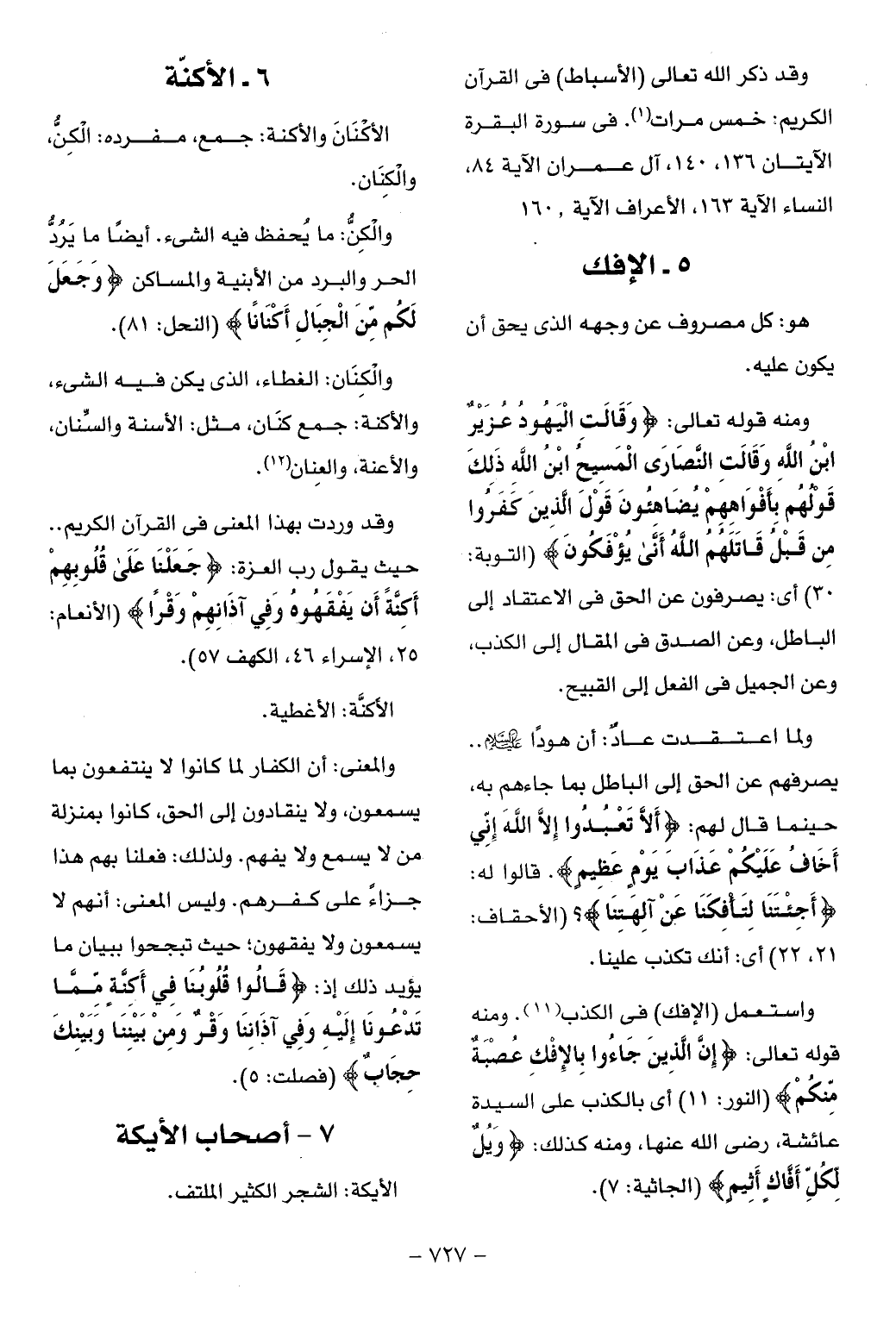 واستعمل (الإفك) فى الكذب (¬11). ومنه قوله تعالى: إِنَّ الَّذِينَ جاؤُ بِالْإِفْكِ عُصْبَةٌ مِنْكُمْ (النور: 11) أى بالكذب على السيدة عائشة، رضى الله عنها، ومنه كذلك: وَيْلٌ لِكُلِّ أَفَّاكٍ أَثِيمٍ (الجاثية: 7).