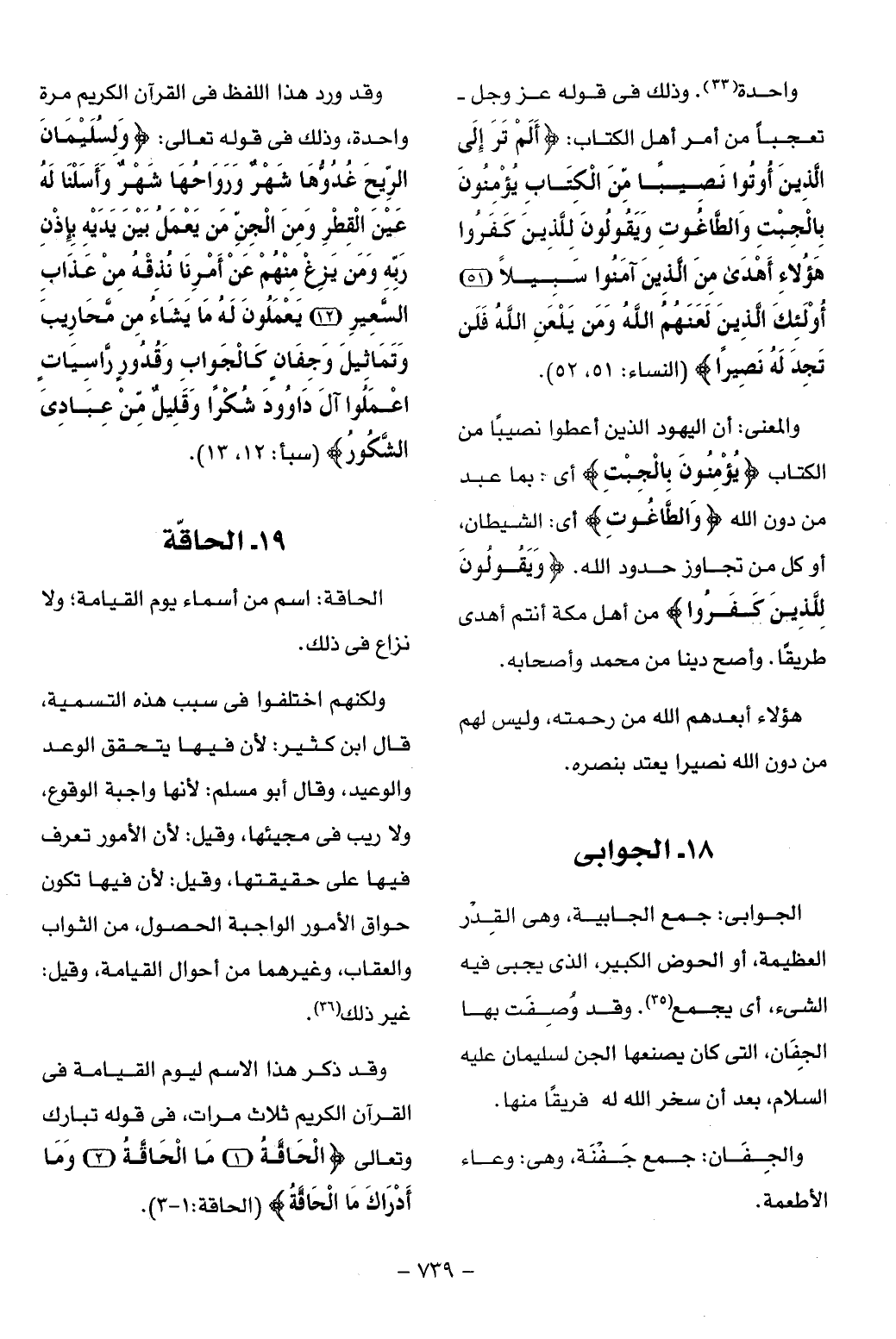 الجوابى: جمع الجابية، وهى القدر العظيمة، أو الحوض الكبير، الذى يجبى فيه الشيء، أى يجمع (¬35). وقد وصفت بها الجفان، التى كان يصنعها الجن لسليمان عليه السلام، بعد أن سخر الله له فريقا منها.