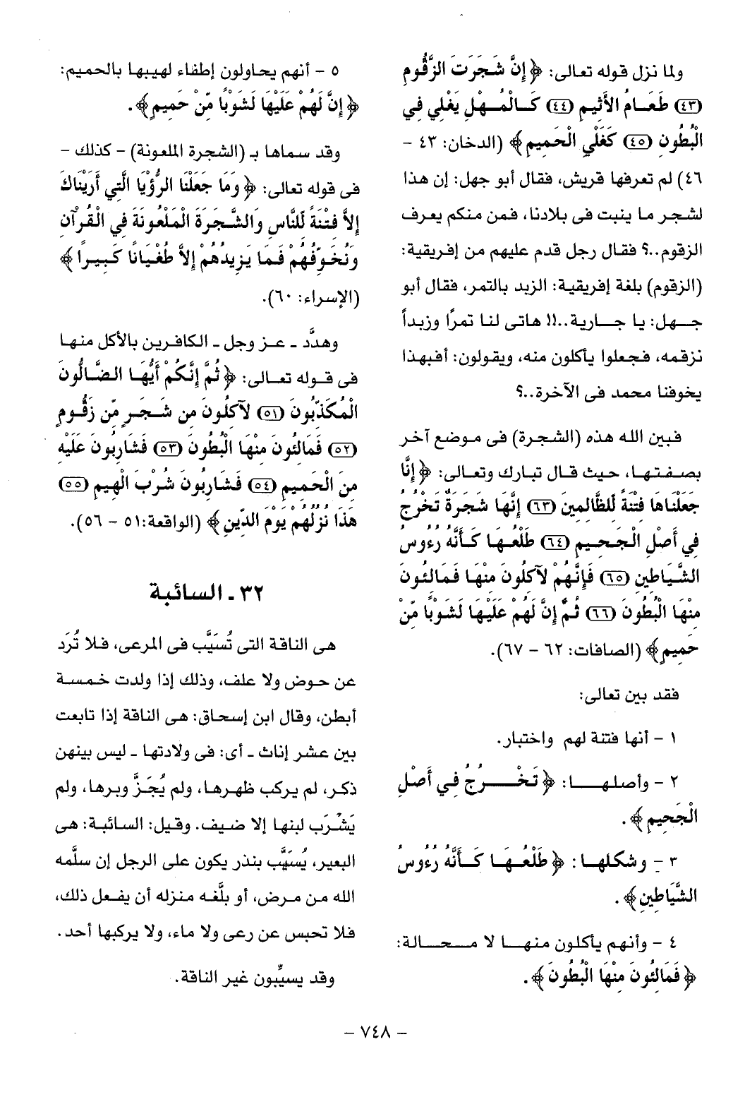 هى الناقة التى تسيّب فى المرعى، فلا ترد عن حوض ولا علف، وذلك إذا ولدت خمسة أبطن، وقال ابن إسحاق: هى الناقة إذا تابعت بين عشر إناث- أى: فى ولادتها- ليس بينهن ذكر، لم يركب ظهرها، ولم يجزّ وبرها، ولم يشرب لبنها إلا ضيف. وقيل: السائبة: هى البعير، يسيّب بنذر يكون على الرجل إن سلّمه الله من مرض، أو بلّغه منزله أن يفعل ذلك، فلا تحبس عن رعى ولا ماء، ولا يركبها أحد.