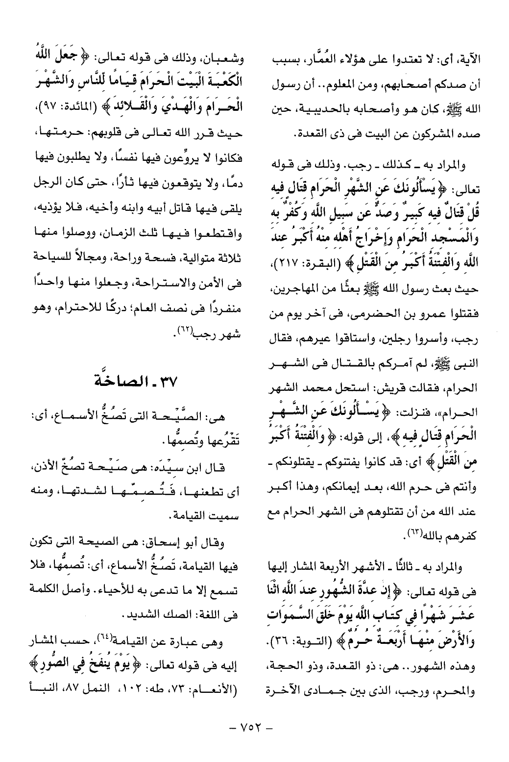والمراد به- كذلك- رجب. وذلك فى قوله تعالى: يَسْئَلُونَكَ عَنِ الشَّهْرِ الْحَرامِ قِتالٍ فِيهِ قُلْ قِتالٌ فِيهِ كَبِيرٌ وَصَدٌّ عَنْ سَبِيلِ اللَّهِ وَكُفْرٌ بِهِ وَالْمَسْجِدِ الْحَرامِ وَإِخْراجُ أَهْلِهِ مِنْهُ أَكْبَرُ عِنْدَ اللَّهِ وَالْفِتْنَةُ أَكْبَرُ مِنَ الْقَتْلِ (البقرة: 217)، حيث بعث رسول الله صلّى الله عليه وسلّم بعثا من المهاجرين، فقتلوا عمرو بن الحضرمى، فى آخر يوم من رجب، وأسروا رجلين، واستاقوا عيرهم، فقال النبى صلّى الله عليه وسلّم، لم آمركم بالقتال فى الشهر الحرام، فقالت قريش: استحل محمد الشهر الحرام»، فنزلت: يَسْئَلُونَكَ عَنِ الشَّهْرِ الْحَرامِ قِتالٍ فِيهِ، إلى قوله: وَالْفِتْنَةُ أَكْبَرُ مِنَ الْقَتْلِ أى: قد كانوا يفتنوكم- يقتلونكم- وأنتم فى حرم الله، بعد إيمانكم، وهذا أكبر عند الله من أن تقتلوهم فى الشهر الحرام مع كفرهم بالله (¬63).