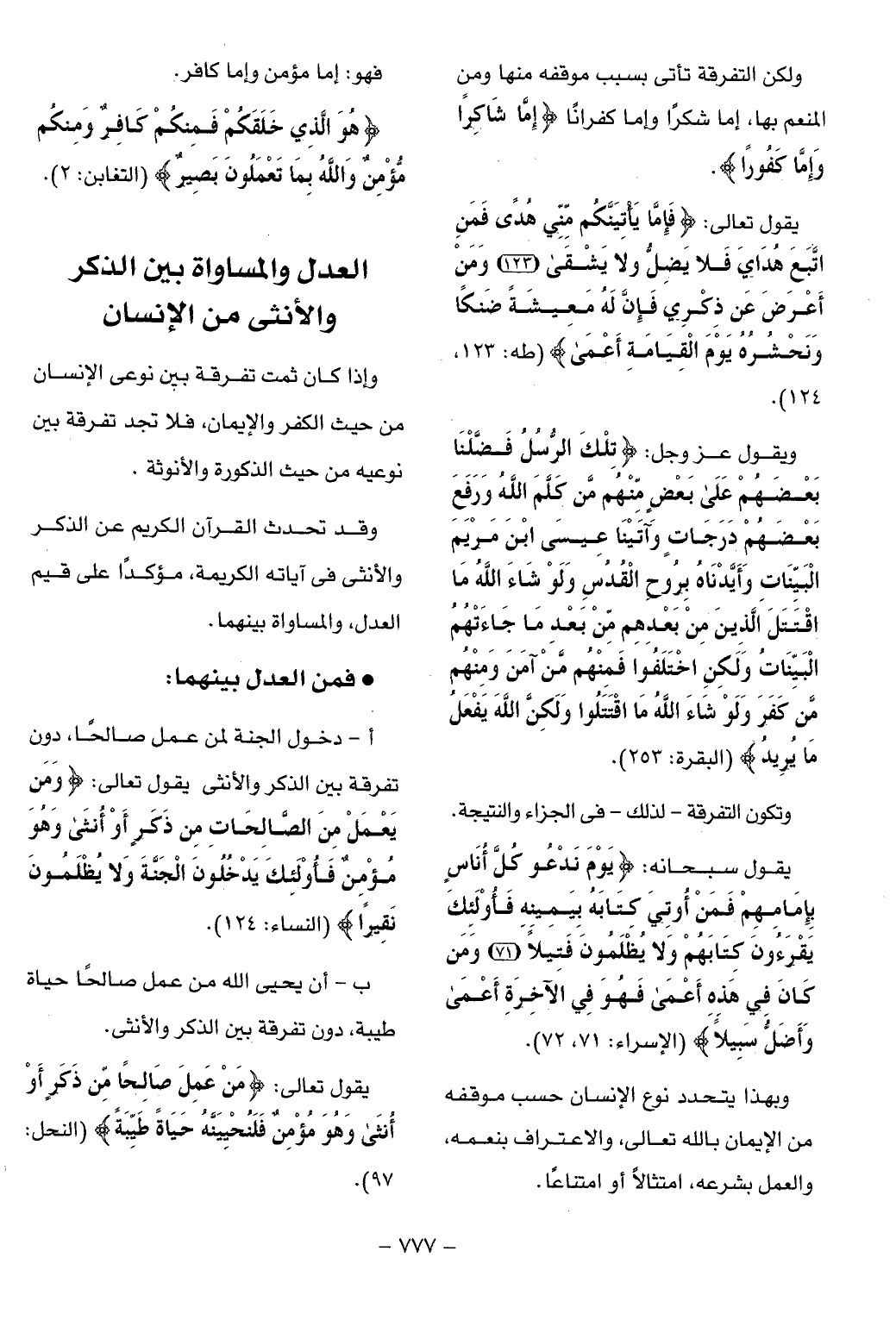 وإذا كان ثمت تفرقة بين نوعى الإنسان من حيث الكفر والإيمان، فلا تجد تفرقة بين نوعيه من حيث الذكورة والأنوثة.