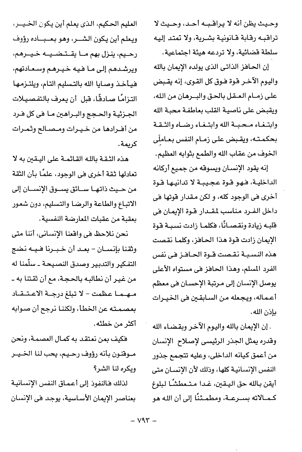 إن الحافز الذاتى الذى يولده الإيمان بالله واليوم الآخر قوة فوق كل القوى، إنه يقبض على زمام العقل بالحق والبرهان من الله، ويقبض على ناصية القلب بعاطفة محبة الله وابتغاء محبة الله وابتغاء رضاه والثقة بحكمته، ويقبض على زمام النفس بعاملى الخوف من عقاب الله والطمع بثوابه العظيم.
