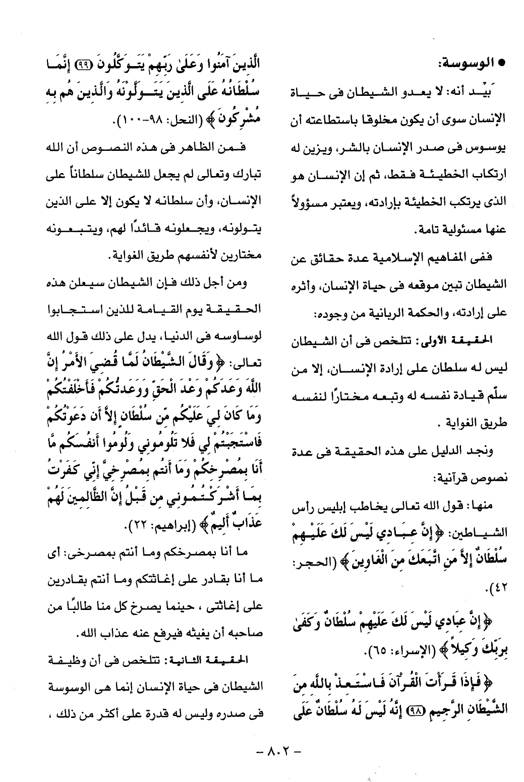 بيد أنه: لا يعدو الشيطان فى حياة الإنسان سوى أن يكون مخلوقا باستطاعته أن يوسوس فى صدر الإنسان بالشر، ويزين له ارتكاب الخطيئة فقط، ثم إن الإنسان هو