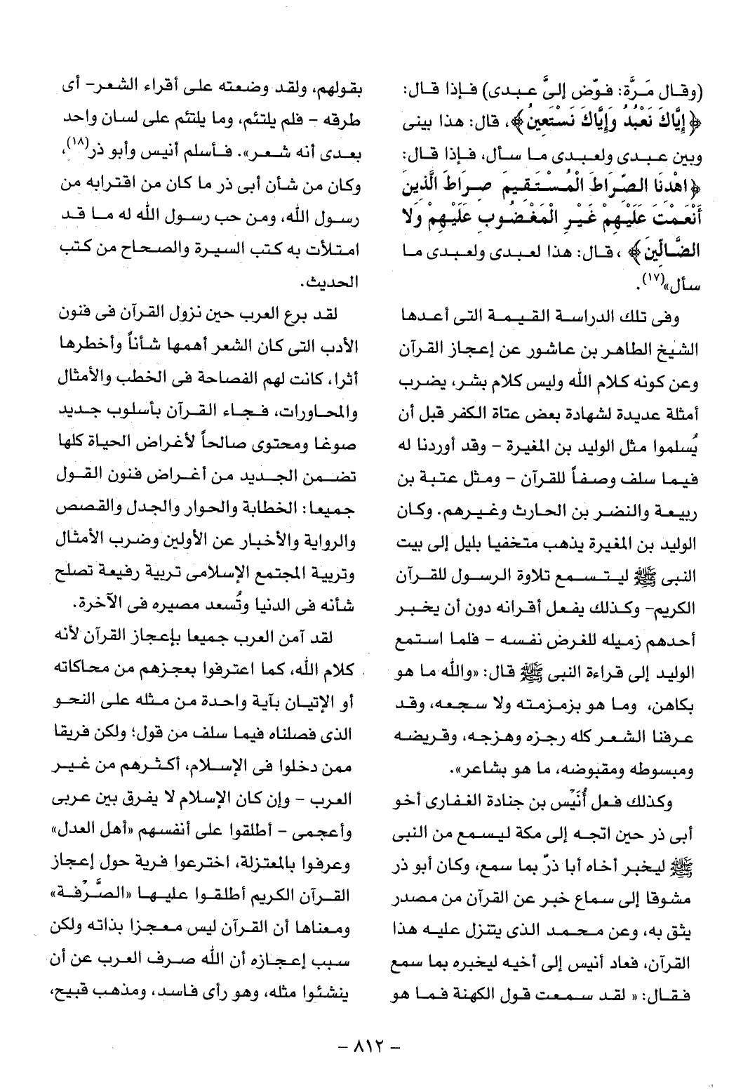 لقد آمن العرب جميعا بإعجاز القرآن لأنه كلام الله، كما اعترفوا بعجزهم من محاكاته أو الإتيان بآية واحدة من مثله على النحو الذى فصلناه فيما سلف من قول؛ ولكن فريقا ممن دخلوا فى الإسلام، أكثرهم من غير العرب- وإن كان الإسلام لا يفرق بين عربى وأعجمى- أطلقوا على أنفسهم «أهل العدل» وعرفوا بالمعتزلة، اخترعوا فرية حول إعجاز القرآن الكريم أطلقوا عليها «الصّرفة» ومعناها أن القرآن ليس معجزا بذاته ولكن سبب إعجازه أن الله صرف العرب عن أن ينشئوا مثله، وهو رأى فاسد، ومذهب قبيح،