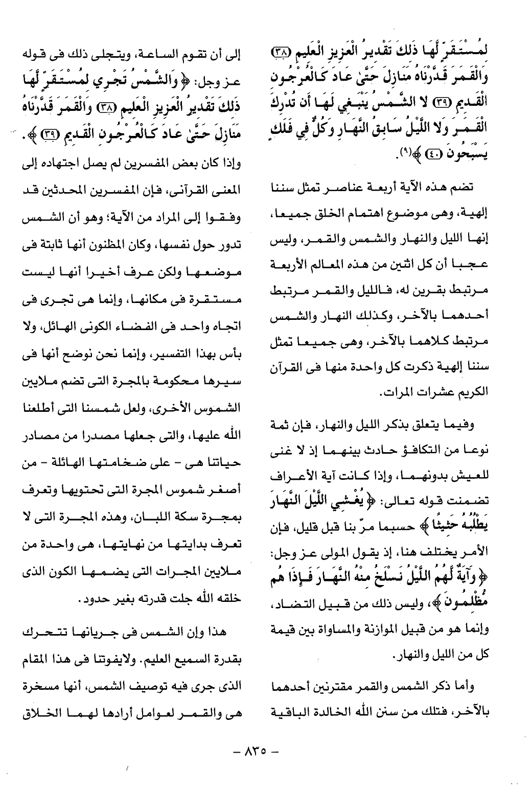 لِمُسْتَقَرٍّ لَها ذلِكَ تَقْدِيرُ الْعَزِيزِ الْعَلِيمِ (38) وَالْقَمَرَ قَدَّرْناهُ مَنازِلَ حَتَّى عادَ كَالْعُرْجُونِ الْقَدِيمِ (39) لَا الشَّمْسُ يَنْبَغِي لَها أَنْ تُدْرِكَ الْقَمَرَ وَلَا اللَّيْلُ سابِقُ النَّهارِ وَكُلٌّ فِي فَلَكٍ يَسْبَحُونَ (40) (¬9).