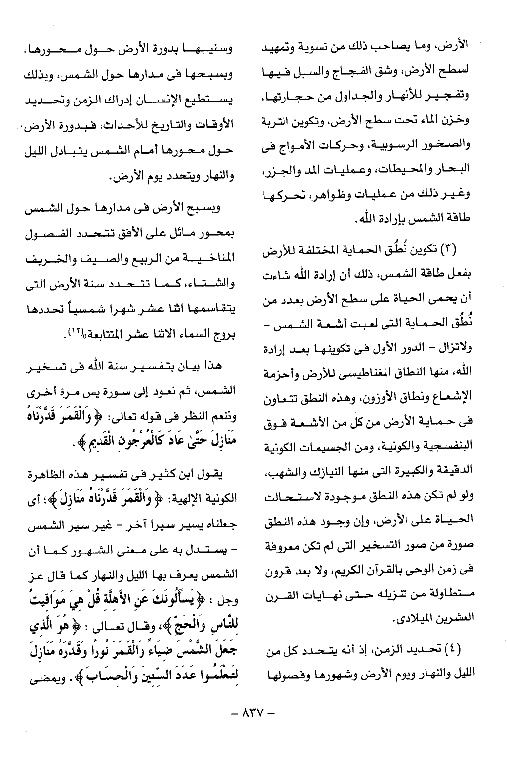 (3) تكوين نطق الحماية المختلفة للأرض بفعل طاقة الشمس، ذلك أن إرادة الله شاءت أن يحمى الحياة على سطح الأرض بعدد من نطق الحماية التى لعبت أشعة الشمس- ولا تزال- الدور الأول فى تكوينها بعد إرادة الله، منها النطاق المغناطيسى للأرض وأحزمة الإشعاع ونطاق الأوزون، وهذه النطق تتعاون فى حماية الأرض من كل من الأشعة فوق البنفسجية والكونية، ومن الجسيمات الكونية الدقيقة والكبيرة التى منها النيازك والشهب، ولو لم تكن هذه النطق موجودة لاستحالت الحياة على الأرض، وإن وجود هذه النطق صورة من صور التسخير التى لم تكن معروفة فى زمن الوحى بالقرآن الكريم، ولا بعد قرون متطاولة من تنزيله حتى نهايات القرن العشرين الميلادى.