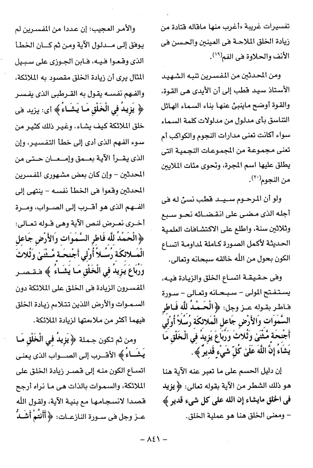 الْحَمْدُ لِلَّهِ فاطِرِ السَّماواتِ وَالْأَرْضِ جاعِلِ الْمَلائِكَةِ رُسُلًا أُولِي أَجْنِحَةٍ مَثْنى وَثُلاثَ وَرُباعَ يَزِيدُ فِي الْخَلْقِ ما يَشاءُ فقصر المفسرون الزيادة فى الخلق على الملائكة دون السموات والأرض اللذين تتلاءم زيادة الخلق فيهما أكثر من ملاءمتها لزيادة الملائكة.