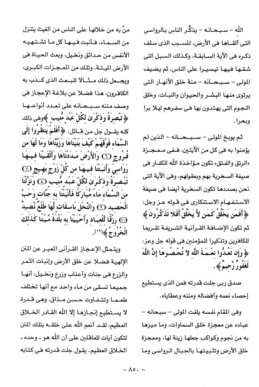 وفى المقام نفسه يلفت المولى- سبحانه- عباده عن معجزة خلق السماوات، وما ميزها به من نجوم وكواكب جعلها زينة لها، ومعجزة خلق الأرض وتثبيتها بالجبال الرواسى وما منّ به من خلالها على الناس من الغيث يتنزل من السماء، فأنبت فيها كل ما تشتهيه الأنفس من حدائق ونخيل، وبعث الحياة فى الأرض الميتة، وتلك من المعجزات الكبرى، ويجعل ذلك مثالا للبعث الذى كذب به الكافرون، هذا فضلا عن بلاغة الإعجاز فى وصف مننه سبحانه على تعدد أنواعها تَبْصِرَةً وَذِكْرى لِكُلِّ عَبْدٍ مُنِيبٍ وفى ذلك كله يقول جل من قائل: أَفَلَمْ يَنْظُرُوا إِلَى السَّماءِ فَوْقَهُمْ كَيْفَ بَنَيْناها وَزَيَّنَّاها وَما لَها مِنْ فُرُوجٍ (6) وَالْأَرْضَ مَدَدْناها وَأَلْقَيْنا فِيها رَواسِيَ وَأَنْبَتْنا فِيها مِنْ كُلِّ زَوْجٍ بَهِيجٍ (7) تَبْصِرَةً وَذِكْرى لِكُلِّ عَبْدٍ مُنِيبٍ (8) وَنَزَّلْنا مِنَ السَّماءِ ماءً مُبارَكاً فَأَنْبَتْنا بِهِ جَنَّاتٍ وَحَبَّ الْحَصِيدِ (9) وَالنَّخْلَ باسِقاتٍ لَها طَلْعٌ نَضِيدٌ (10) رِزْقاً لِلْعِبادِ وَأَحْيَيْنا بِهِ بَلْدَةً مَيْتاً كَذلِكَ الْخُرُوجُ (¬19).