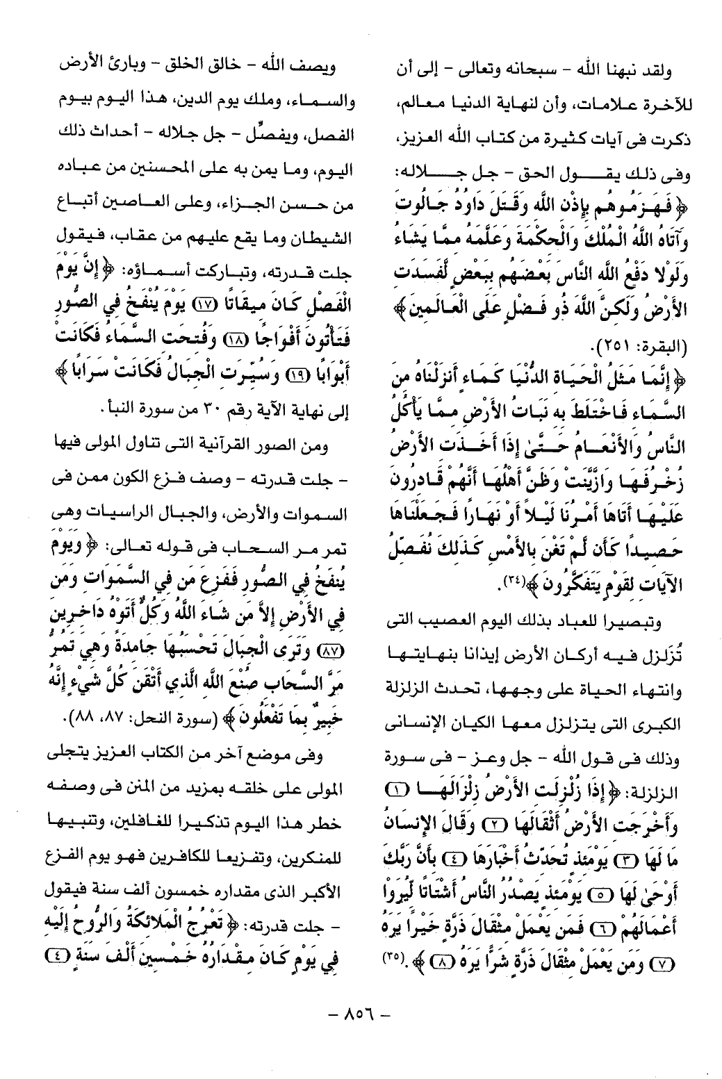 ويصف الله- خالق الخلق- وبارئ الأرض والسماء، وملك يوم الدين، هذا اليوم بيوم الفصل، ويفصّل- جل جلاله- أحداث ذلك اليوم، وما يمن به على المحسنين من عباده من حسن الجزاء، وعلى العاصين أتباع الشيطان وما يقع عليهم من عقاب، فيقول جلت قدرته، وتباركت أسماؤه: إِنَّ يَوْمَ الْفَصْلِ كانَ مِيقاتاً (17) يَوْمَ يُنْفَخُ فِي الصُّورِ فَتَأْتُونَ أَفْواجاً (18) وَفُتِحَتِ السَّماءُ فَكانَتْ أَبْواباً (19) وَسُيِّرَتِ الْجِبالُ فَكانَتْ سَراباً إلى نهاية الآية رقم 30 من سورة النبأ.