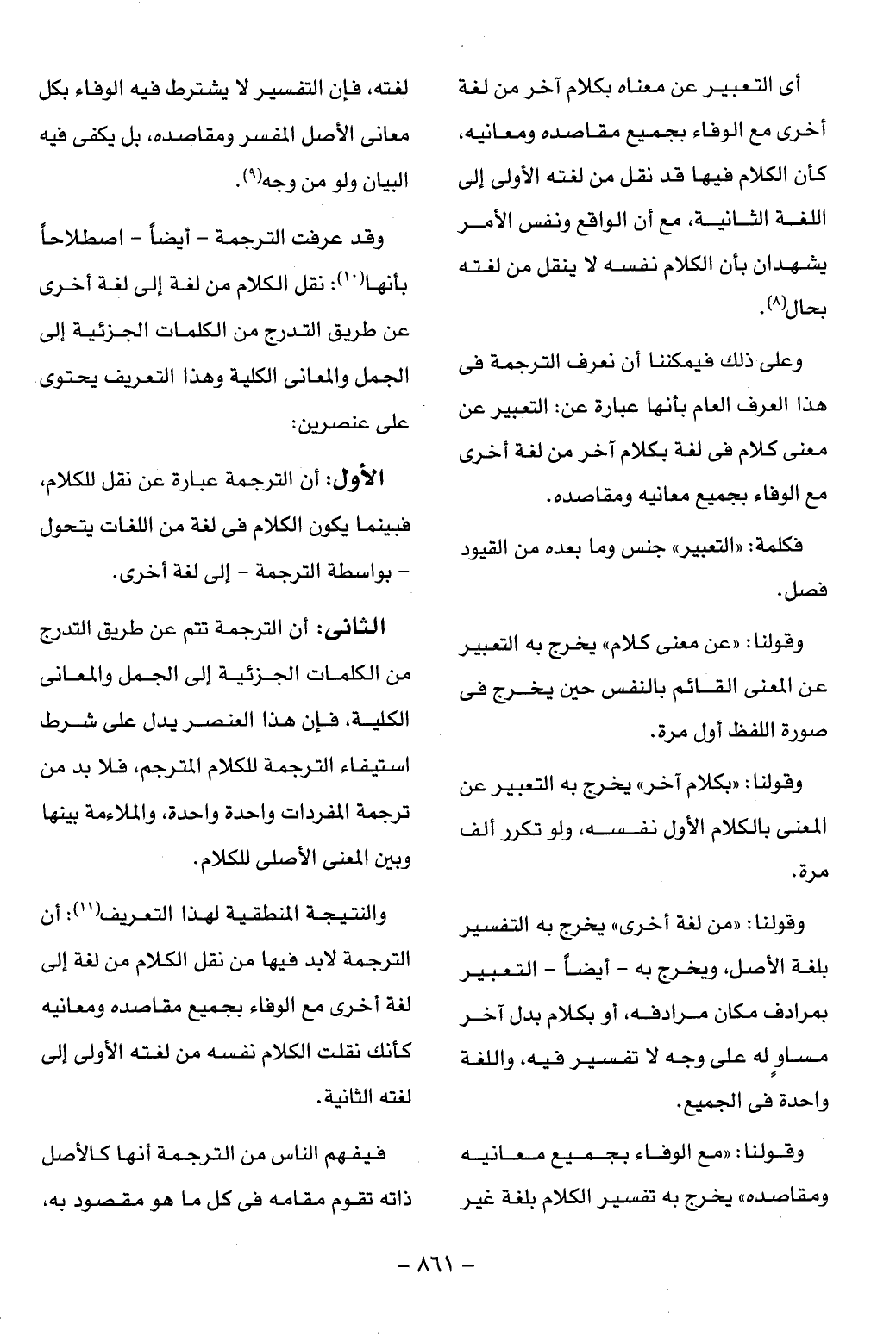 أى التعبير عن معناه بكلام آخر من لغة أخرى مع الوفاء بجميع مقاصده ومعانيه، كأن الكلام فيها قد نقل من لغته الأولى إلى اللغة الثانية، مع أن الواقع ونفس الأمر يشهدان بأن الكلام نفسه لا ينقل من لغته بحال (¬8).