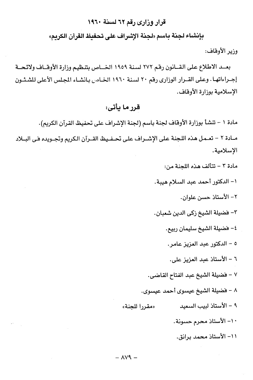 قرار وزارى رقم 62 لسنة 1960 بإنشاء لجنة باسم «لجنة الإشراف على تحفيظ القرآن الكريم» وزير الأوقاف: