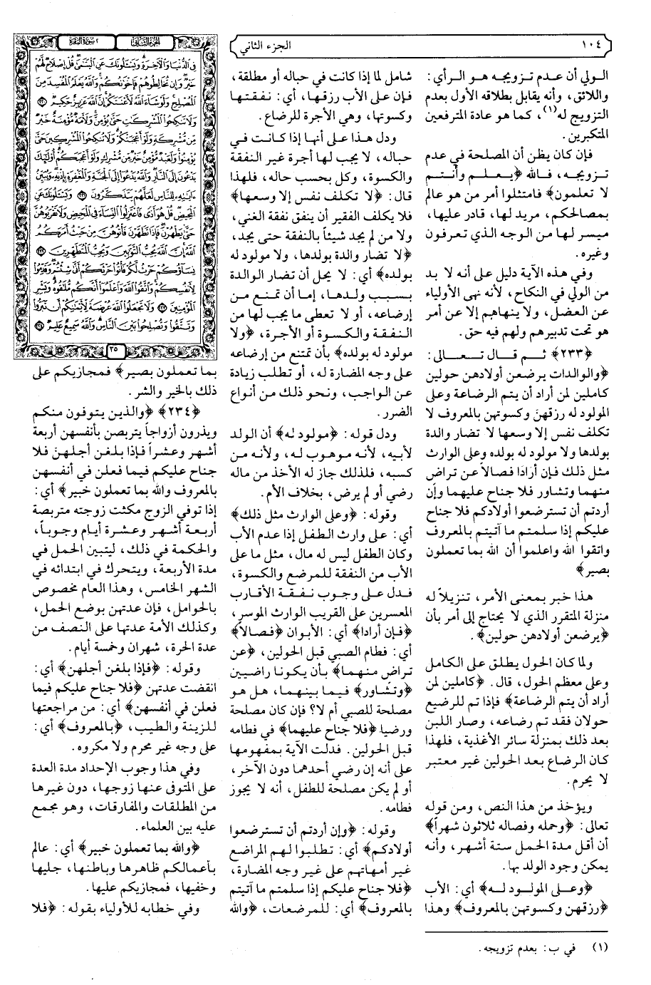 {٢٣٣} {وَالْوَالِدَاتُ يُرْضِعْنَ أَوْلادَهُنَّ حَوْلَيْنِ كَامِلَيْنِ لِمَنْ أَرَادَ أَنْ يُتِمَّ الرَّضَاعَةَ وَعَلَى الْمَوْلُودِ لَهُ رِزْقُهُنَّ وَكِسْوَتُهُنَّ بِالْمَعْرُوفِ لا تُكَلَّفُ نَفْسٌ إِلا وُسْعَهَا لا تُضَارَّ وَالِدَةٌ بِوَلَدِهَا وَلا مَوْلُودٌ لَهُ بِوَلَدِهِ وَعَلَى الْوَارِثِ مِثْلُ ذَلِكَ فَإِنْ أَرَادَا فِصَالا عَنْ تَرَاضٍ مِنْهُمَا وَتَشَاوُرٍ فَلا جُنَاحَ عَلَيْهِمَا وَإِنْ أَرَدْتُمْ أَنْ تَسْتَرْضِعُوا أَوْلادَكُمْ فَلا جُنَاحَ عَلَيْكُمْ إِذَا سَلَّمْتُمْ مَا آتَيْتُمْ بِالْمَعْرُوفِ وَاتَّقُوا اللَّهَ وَاعْلَمُوا أَنَّ اللَّهَ بِمَا تَعْمَلُونَ بَصِيرٌ} .