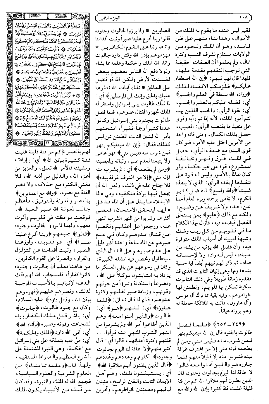 {٢٤٩-٢٥٢} {فَلَمَّا فَصَلَ طَالُوتُ بِالْجُنُودِ قَالَ إِنَّ اللَّهَ مُبْتَلِيكُمْ بِنَهَرٍ فَمَنْ شَرِبَ مِنْهُ فَلَيْسَ مِنِّي وَمَنْ لَمْ يَطْعَمْهُ فَإِنَّهُ مِنِّي إِلا مَنِ اغْتَرَفَ غُرْفَةً بِيَدِهِ فَشَرِبُوا مِنْهُ إِلا قَلِيلا مِنْهُمْ فَلَمَّا جَاوَزَهُ هُوَ وَالَّذِينَ آمَنُوا مَعَهُ قَالُوا لا طَاقَةَ لَنَا الْيَوْمَ بِجَالُوتَ وَجُنُودِهِ قَالَ الَّذِينَ يَظُنُّونَ أَنَّهُمْ مُلاقُو اللَّهِ كَمْ مِنْ فِئَةٍ قَلِيلَةٍ غَلَبَتْ فِئَةً كَثِيرَةً بِإِذْنِ اللَّهِ وَاللَّهُ مَعَ الصَّابِرِينَ * وَلَمَّا بَرَزُوا لِجَالُوتَ وَجُنُودِهِ قَالُوا رَبَّنَا أَفْرِغْ عَلَيْنَا صَبْرًا وَثَبِّتْ أَقْدَامَنَا وَانْصُرْنَا عَلَى الْقَوْمِ الْكَافِرِينَ * فَهَزَمُوهُمْ بِإِذْنِ اللَّهِ وَقَتَلَ دَاوُدُ جَالُوتَ وَآتَاهُ اللَّهُ الْمُلْكَ وَالْحِكْمَةَ وَعَلَّمَهُ مِمَّا يَشَاءُ وَلَوْلا دَفْعُ اللَّهِ النَّاسَ بَعْضَهُمْ بِبَعْضٍ لَفَسَدَتِ الأرْضُ وَلَكِنَّ اللَّهَ ذُو فَضْلٍ عَلَى الْعَالَمِينَ * تِلْكَ آيَاتُ اللَّهِ نَتْلُوهَا عَلَيْكَ بِالْحَقِّ وَإِنَّكَ لَمِنَ الْمُرْسَلِينَ} .