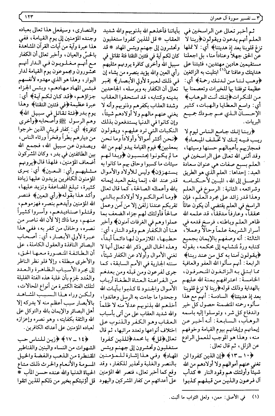 {١٠ - ١٣} {إِنَّ الَّذِينَ كَفَرُوا لَنْ تُغْنِيَ عَنْهُمْ أَمْوَالُهُمْ وَلا أَوْلادُهُمْ مِنَ اللَّهِ شَيْئًا وَأُولَئِكَ هُمْ وَقُودُ النَّارِ * كَدَأْبِ آلِ فِرْعَوْنَ وَالَّذِينَ مِنْ قَبْلِهِمْ كَذَّبُوا بِآيَاتِنَا فَأَخَذَهُمُ اللَّهُ بِذُنُوبِهِمْ وَاللَّهُ شَدِيدُ الْعِقَابِ * قُلْ لِلَّذِينَ كَفَرُوا سَتُغْلَبُونَ وَتُحْشَرُونَ إِلَى جَهَنَّمَ وَبِئْسَ الْمِهَادُ * قَدْ كَانَ لَكُمْ آيَةٌ فِي فِئَتَيْنِ الْتَقَتَا فِئَةٌ تُقَاتِلُ فِي سَبِيلِ اللَّهِ وَأُخْرَى كَافِرَةٌ يَرَوْنَهُمْ مِثْلَيْهِمْ رَأْيَ الْعَيْنِ وَاللَّهُ يُؤَيِّدُ بِنَصْرِهِ مَنْ يَشَاءُ إِنَّ فِي ذَلِكَ لَعِبْرَةً لأولِي الأبْصَارِ} .