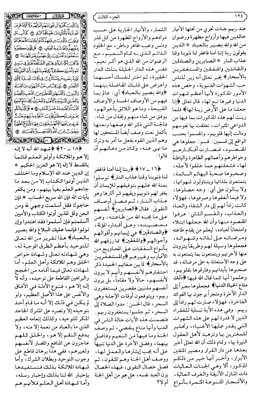 فقال {الصابرين} أنفسهم على ما يحبه الله من طاعته، وعن معصيته، وعلى أقداره المؤلمة، {والصادقين} في إيمانهم وأقوالهم وأحوالهم {والمنفقين} مما رزقهم الله بأنواع النفقات على المحاويج من الأقارب وغيرهم {والمستغفرين بالأسحار} لما بين صفاتهم الحميدة ذكر احتقارهم لأنفسهم وأنهم لا يرون لأنفسهم، حالا ولا مقاما، بل يرون أنفسهم مذنبين مقصرين فيستغفرون ربهم، ويتوقعون أوقات الإجابة وهي السحر، قال الحسن: مدوا الصلاة إلى السحر، ثم جلسوا يستغفرون ربهم. فتضمنت هذه الآيات حالة الناس في الدنيا وأنها متاع ينقضي، ثم وصف الجنة وما فيها من النعيم وفاضل بينهما، وفضل الآخرة على الدنيا تنبيها على أنه يجب إيثارها والعمل لها، ووصف أهل الجنة وهم المتقون، ثم فصل خصال التقوى، فبهذه الخصال يزن العبد نفسه، هل هو من أهل الجنة أم لا؟