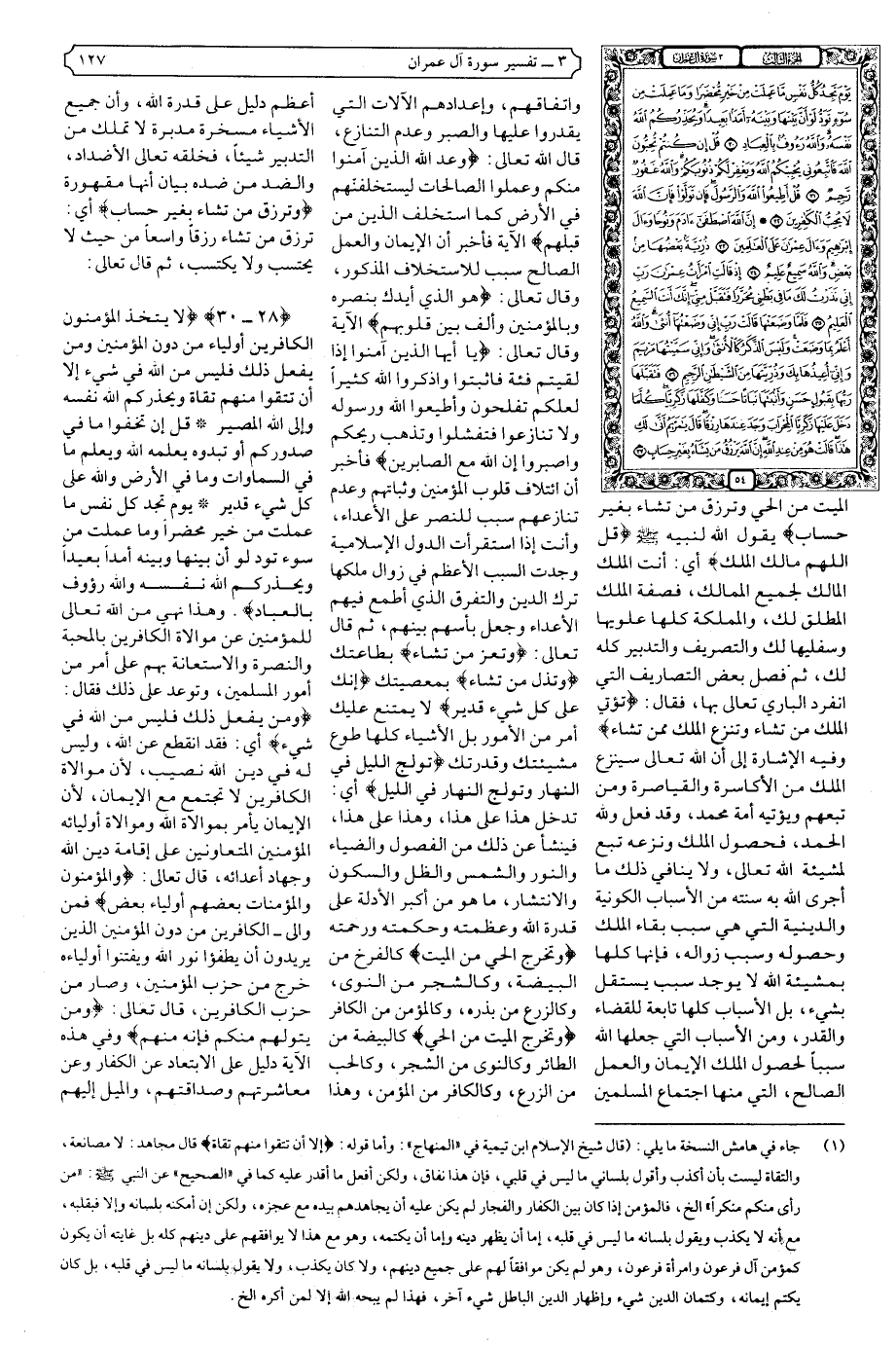 (١) جاء في هامش النسخة ما يلي: (قال شيخ الإسلام ابن تيمية في "المنهاج": وأما قوله: "إلا أن تتقوا منهم تقاة" قال مجاهد: لا مصانعة، والتقاة ليست بأن أكذب وأقول بلساني ما ليس في قلبي، فإن هذا نفاق، ولكن أفعل ما أقدر عليه كما في "الصحيح" عن النبي صلى الله عليه وسلم: "من رأى منكم منكرا" إلخ، فالمؤمن إذا كان بين الكفار والفجار لم يكن عليه أن يجاهدهم بيده مع عجزه، ولكن إن أمكنه بلسانه وإلا فبقلبه، مع أنه لا يكذب ويقول بلسانه ما ليس في قلبه، إما أن يظهر دينه وإما أن يكتمه، وهو مع هذا لا يوافقهم على دينهم كله بل غايته أن يكون كمؤمن آل فرعون وامرأة فرعون، وهو لم يكن موافقا لهم على جميع دينهم، ولا كان يكذب، ولا يقول بلسانه ما ليس في قلبه، بل كان يكتم إيمانه، وكتمان الدين شيء وإظهار الدين الباطل شيء آخر، فهذا لم يبحه الله إلا لمن أكره إلخ