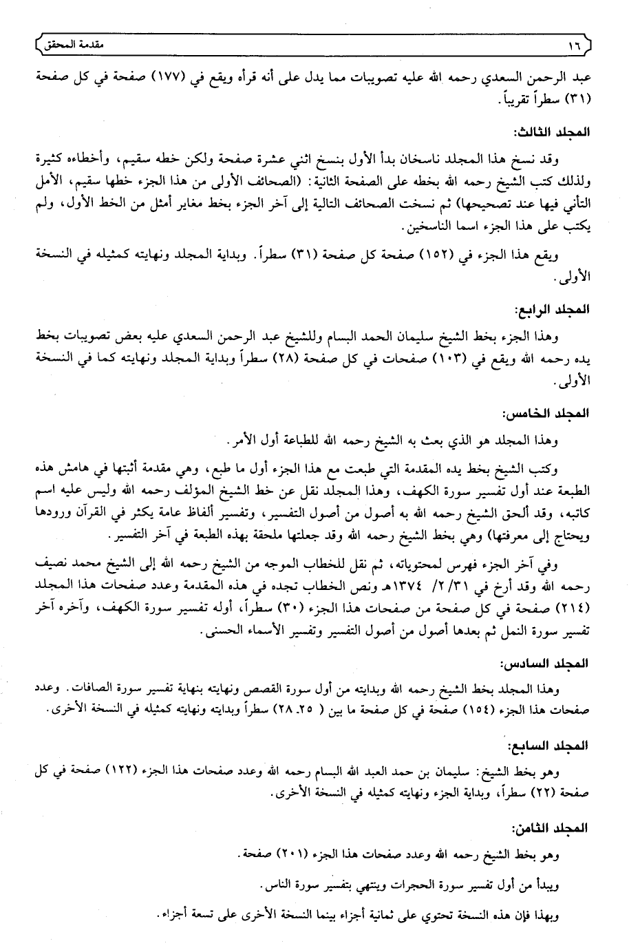 عبد الرحمن السعدي رحمه الله عليه تصويبات مما يدل على أنه قرأه ويقع في (١٧٧) صفحة في كل صفحة (٣١) سطرا تقريبا.