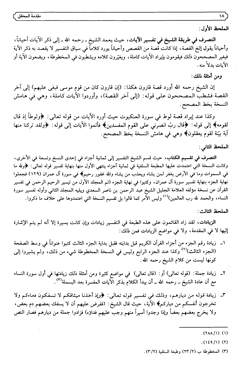 ١- زيادة رقم الجزء من أجزاء القرآن الكريم قبل بدايته فقبل بداية الجزء الثالث كتبوا عنوانا في وسط الصفحة (الجزء الثالث) (٢) وكذا عند الجزء الرابع وليس في النسخة المخطوطة شيء من ذلك، ولم يشيروا إلى كونها ليست من كلام الشيخ رحمه الله.