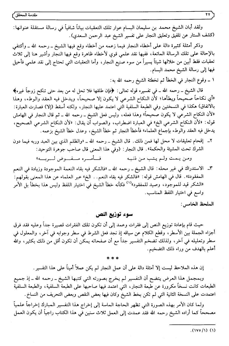 قال الشيخ -رحمه الله- في تفسيره قوله تعالى: {فَإِنْ طَلَّقَهَا فَلا تَحِلُّ لَهُ مِنْ بَعْدُ حَتَّى تَنْكِحَ زَوْجًا غَيْرَهُ} "أي نكاحا صحيحا ويطأها؛ لأن النكاح الشرعي لا يكون إلا صحيحا، ويدخل فيه العقد والوطء، وهذا بالاتفاق) هكذا في النسختين وفي الطبعة السلفية التي اعتمد عليها النجار، ولكنه أسقط (إلا) فصارت العبارة: "لأن النكاح الشرعي لا يكون صحيحا" وهذا فعله، وليس فعل الشيخ -رحمه الله- ثم قال النجار في الهامش قوله: "لأن النكاح الشرعي إلخ" في العبارة اضطراب، والصواب أن يقال: "لأن النكاح الشرعي الصحيح، يدخل فيه العقد والوطء بإجماع العلماء" فأخطأ النجار ثم خطأ الشيخ، وعدل خطأ الشيخ بزعمه.