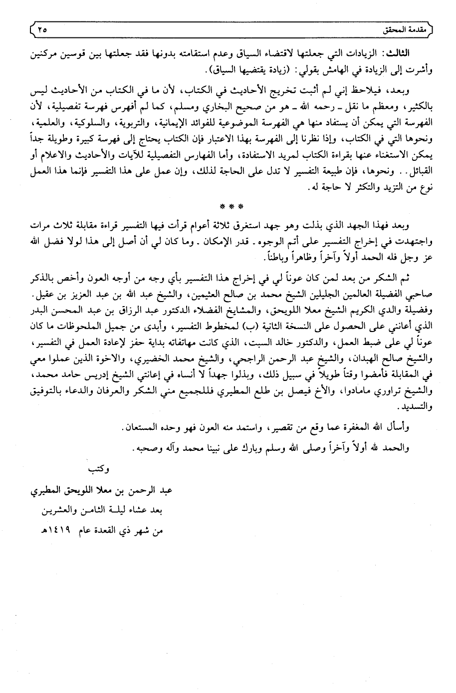 ثم الشكر من بعد لمن كان عونا لي في إخراج هذا التفسير بأي وجه من أوجه العون وأخص بالذكر صاحبي الفضيلة العالمين الجليلين الشيخ محمد بن صالح العثيمين، والشيخ عبد الله بن عبد العزيز بن عقيل. وفضيلة والدي الكريم الشيخ معلا اللويحق، والمشايخ الفضلاء الدكتور عبد الرزاق بن عبد المحسن البدر الذي أعانني على الحصول على النسخة الثانية (ب) لمخطوط التفسير، وأبدى من جميل الملحوظات ما كان عونا لي على ضبط العمل، والدكتور خالد السبت، الذي كانت مهاتفاته بداية حفز لإعادة العمل في التفسير، والشيخ صالح الهبدان، والشيخ عبد الرحمن الراجحي، والشيخ محمد الخضيري، والإخوة الذين عملوا معي في المقابلة فأمضوا وقتا طويلا في سبيل ذلك، وبذلوا جهدا لا أنساه في إعانتي الشيخ إدريس حامد محمد، والشيخ تراوري مامادوا، والأخ فيصل بن طلع المطيري فللجميع مني الشكر والعرفان والدعاء بالتوفيق والتسديد.