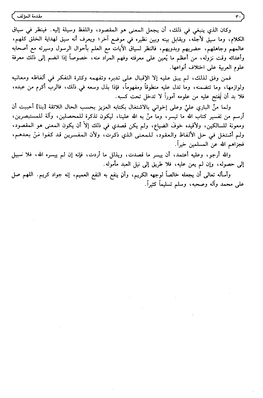 ولما من الباري علي وعلى إخواني بالاشتغال بكتابه العزيز بحسب الحال اللائقة [بنا] أحببت أن أرسم من تفسير كتاب الله ما تيسر، وما من به الله علينا، ليكون تذكرة للمحصلين، وآلة للمستبصرين، ومعونة للسالكين، ولأقيده خوف الضياع، ولم يكن قصدي في ذلك إلا أن يكون المعنى هو المقصود، ولم أشتغل في حل الألفاظ والعقود، للمعنى الذي ذكرت، ولأن المفسرين قد كفوا من بعدهم، فجزاهم الله عن المسلمين خيرا.