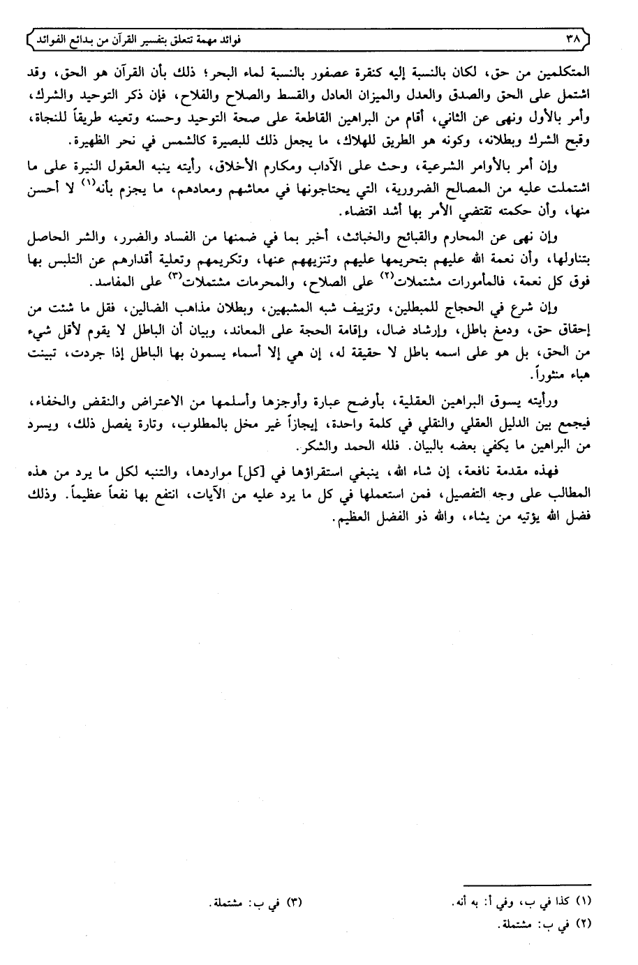 فهذه مقدمة نافعة، إن شاء الله، ينبغي استقراؤها في [كل] مواردها، والتنبه لكل ما يرد من هذه المطالب على وجه التفصيل، فمن استعملها في كل ما يرد عليه من الآيات، انتفع بها نفعا عظيما. وذلك فضل الله يؤتيه من يشاء، والله ذو الفضل العظيم.