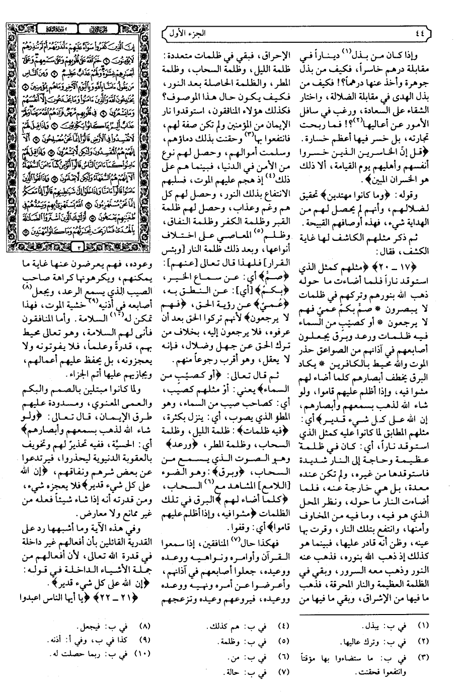 {١٧ - ٢٠} {مَثَلُهُمْ كَمَثَلِ الَّذِي اسْتَوْقَدَ نَارًا فَلَمَّا أَضَاءَتْ مَا حَوْلَهُ ذَهَبَ اللَّهُ بِنُورِهِمْ وَتَرَكَهُمْ فِي ظُلُمَاتٍ لا يُبْصِرُونَ * صُمٌّ بُكْمٌ عُمْيٌ فَهُمْ لا يَرْجِعُونَ * أَوْ كَصَيِّبٍ مِنَ السَّمَاءِ فِيهِ ظُلُمَاتٌ وَرَعْدٌ وَبَرْقٌ يَجْعَلُونَ أَصَابِعَهُمْ فِي آذَانِهِمْ مِنَ الصَّوَاعِقِ حَذَرَ الْمَوْتِ وَاللَّهُ مُحِيطٌ بِالْكَافِرِينَ * يَكَادُ الْبَرْقُ يَخْطَفُ أَبْصَارَهُمْ كُلَّمَا أَضَاءَ لَهُمْ مَشَوْا فِيهِ وَإِذَا أَظْلَمَ عَلَيْهِمْ قَامُوا وَلَوْ شَاءَ اللَّهُ لَذَهَبَ بِسَمْعِهِمْ وَأَبْصَارِهِمْ إِنَّ اللَّهَ عَلَى كُلِّ شَيْءٍ قَدِيرٌ} .