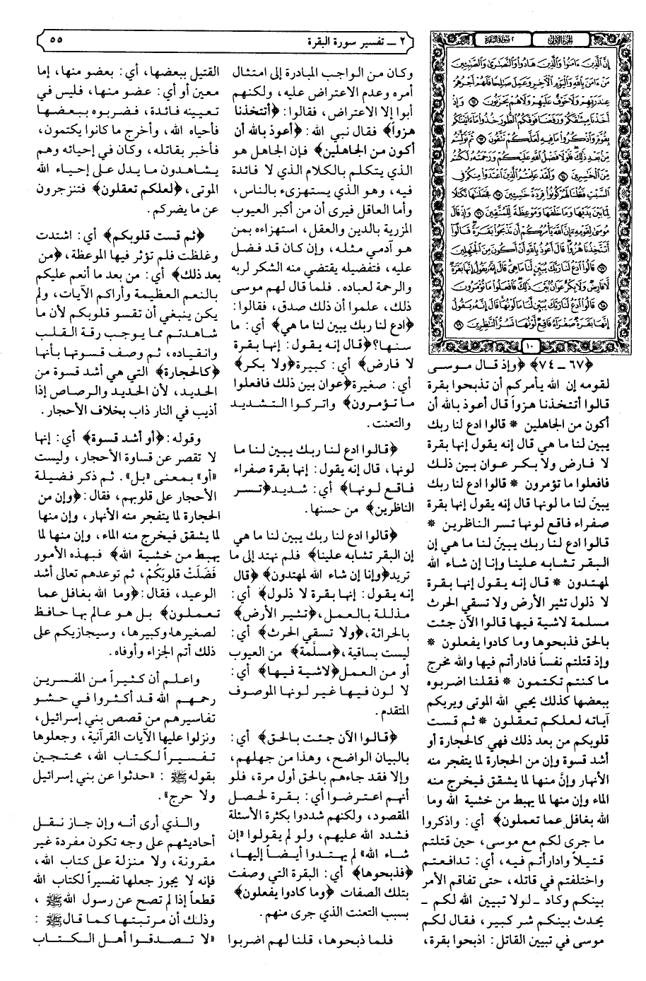 {قَالُوا ادْعُ لَنَا رَبَّكَ يُبَيِّنْ لَنَا مَا هِيَ إِنَّ الْبَقَرَ تَشَابَهَ عَلَيْنَا وَإِنَّا إِنْ شَاءَ اللَّهُ لَمُهْتَدُونَ * قَالَ إِنَّهُ يَقُولُ إِنَّهَا بَقَرَةٌ لا ذَلُولٌ تُثِيرُ الأرْضَ وَلا تَسْقِي الْحَرْثَ مُسَلَّمَةٌ لا شِيَةَ فِيهَا قَالُوا الآنَ جِئْتَ بِالْحَقِّ فَذَبَحُوهَا وَمَا كَادُوا يَفْعَلُونَ * وَإِذْ قَتَلْتُمْ نَفْسًا فَادَّارَأْتُمْ فِيهَا وَاللَّهُ مُخْرِجٌ مَا كُنْتُمْ تَكْتُمُونَ * فَقُلْنَا اضْرِبُوهُ بِبَعْضِهَا كَذَلِكَ يُحْيِي اللَّهُ الْمَوْتَى وَيُرِيكُمْ آيَاتِهِ لَعَلَّكُمْ تَعْقِلُونَ * ثُمَّ قَسَتْ قُلُوبُكُمْ مِنْ بَعْدِ ذَلِكَ فَهِيَ كَالْحِجَارَةِ أَوْ أَشَدُّ قَسْوَةً وَإِنَّ مِنَ الْحِجَارَةِ لَمَا يَتَفَجَّرُ مِنْهُ الأنْهَارُ وَإِنَّ مِنْهَا لَمَا يَشَّقَّقُ فَيَخْرُجُ مِنْهُ الْمَاءُ وَإِنَّ مِنْهَا لَمَا يَهْبِطُ مِنْ خَشْيَةِ اللَّهِ وَمَا اللَّهُ بِغَافِلٍ عَمَّا تَعْمَلُونَ} .