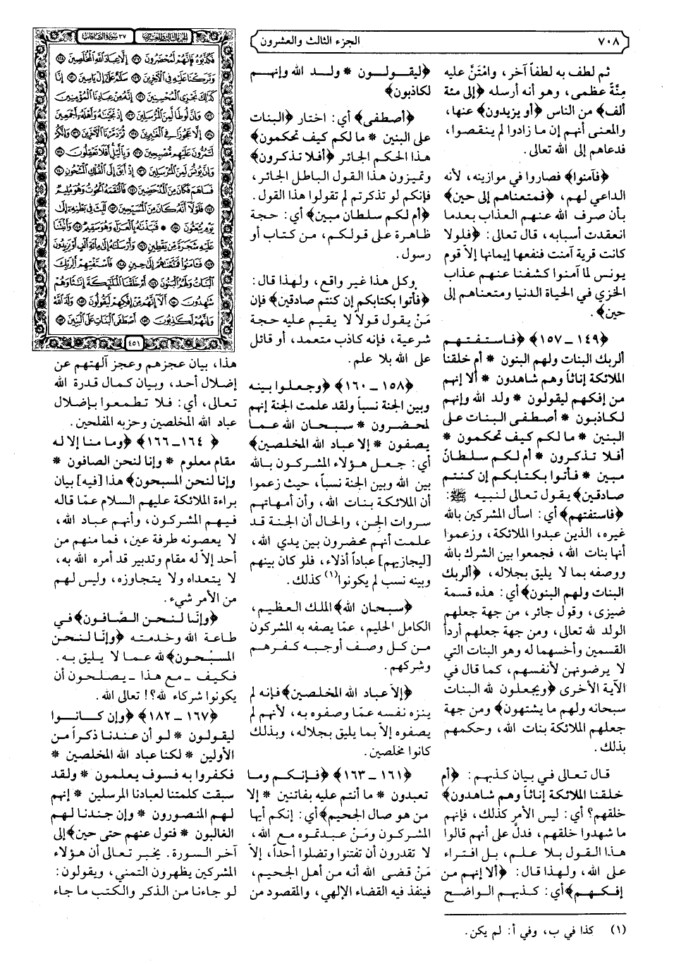 {١٤٩ - ١٥٧} {فَاسْتَفْتِهِمْ أَلِرَبِّكَ الْبَنَاتُ وَلَهُمُ الْبَنُونَ * أَمْ خَلَقْنَا الْمَلائِكَةَ إِنَاثًا وَهُمْ شَاهِدُونَ * أَلا إِنَّهُمْ مِنْ إِفْكِهِمْ لَيَقُولُونَ * وَلَدَ اللَّهُ وَإِنَّهُمْ لَكَاذِبُونَ * أَصْطَفَى الْبَنَاتِ عَلَى الْبَنِينَ} .