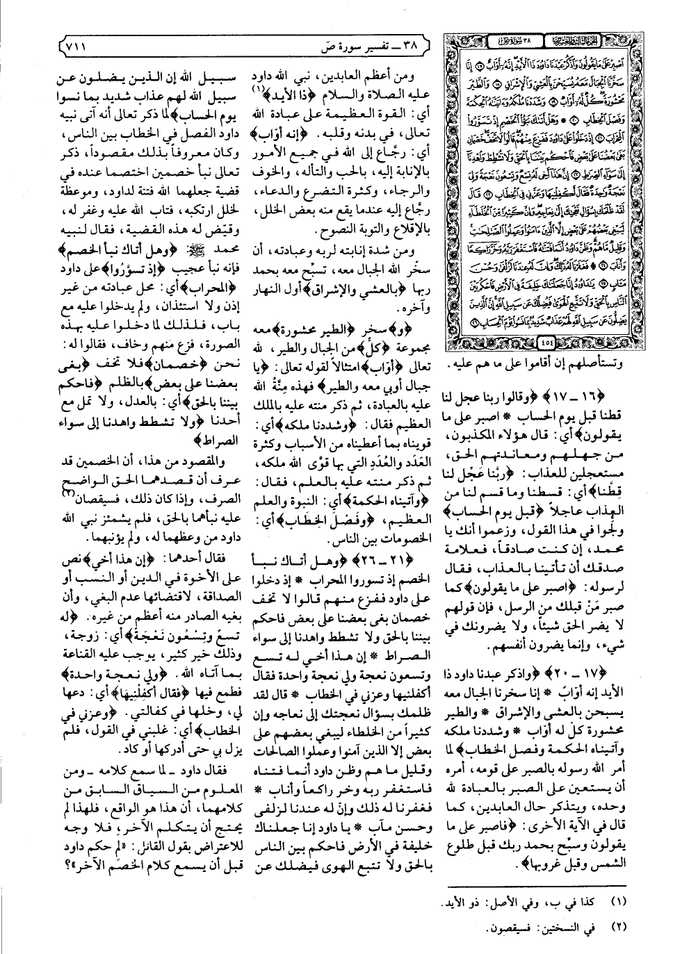 {٢١ - ٢٦} {وَهَلْ أَتَاكَ نَبَأُ الْخَصْمِ إِذْ تَسَوَّرُوا الْمِحْرَابَ * إِذْ دَخَلُوا عَلَى دَاوُدَ فَفَزِعَ مِنْهُمْ قَالُوا لا تَخَفْ خَصْمَانِ بَغَى بَعْضُنَا عَلَى بَعْضٍ فَاحْكُمْ بَيْنَنَا بِالْحَقِّ وَلا تُشْطِطْ وَاهْدِنَا إِلَى سَوَاءِ الصِّرَاطِ * إِنَّ هَذَا أَخِي لَهُ تِسْعٌ وَتِسْعُونَ نَعْجَةً وَلِيَ نَعْجَةٌ وَاحِدَةٌ فَقَالَ أَكْفِلْنِيهَا وَعَزَّنِي فِي الْخِطَابِ * قَالَ لَقَدْ ظَلَمَكَ بِسُؤَالِ نَعْجَتِكَ إِلَى نِعَاجِهِ وَإِنَّ كَثِيرًا مِنَ الْخُلَطَاءِ لَيَبْغِي بَعْضُهُمْ عَلَى بَعْضٍ إِلا الَّذِينَ آمَنُوا وَعَمِلُوا الصَّالِحَاتِ وَقَلِيلٌ مَا هُمْ وَظَنَّ دَاوُدُ أَنَّمَا فَتَنَّاهُ فَاسْتَغْفَرَ رَبَّهُ وَخَرَّ رَاكِعًا وَأَنَابَ * فَغَفَرْنَا لَهُ ذَلِكَ وَإِنَّ لَهُ عِنْدَنَا لَزُلْفَى وَحُسْنَ مَآبٍ * يَا دَاوُدُ إِنَّا جَعَلْنَاكَ خَلِيفَةً فِي الأرْضِ فَاحْكُمْ بَيْنَ النَّاسِ بِالْحَقِّ وَلا تَتَّبِعِ الْهَوَى فَيُضِلَّكَ عَنْ سَبِيلِ اللَّهِ إِنَّ الَّذِينَ يَضِلُّونَ عَنْ سَبِيلِ اللَّهِ لَهُمْ عَذَابٌ شَدِيدٌ بِمَا نَسُوا يَوْمَ الْحِسَابِ} .